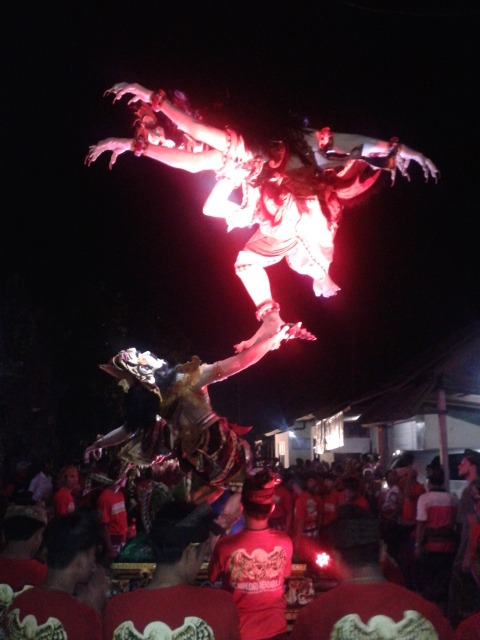 그렇게 맞이한 3월 말 무렵. 언제부턴가 마을 군데군데에 있는 회관에서 커다란 탈이라고 해야 할지, 아님 인형이라고 해야 할지, 뿔 달리고 무서운 괴수 형체스러운 '것'들을 심심치 않게 볼 수 있었다. 이건 뭐 웬만한 발리 가정집에는 들여다 놓을 수도 없을만한 크기였는데 그 정도가 어느 정도냐 하냐면, 건물 2-3층은 훌쩍 넘을 정도라 목을 꺾어 올려다보아야 할 크기였다. 더군다나 그렇게 큰 '것'은 양손에 길고 날카로운 손톱도 가지고 있었고, 한번 휘둘리다 얻어맞으면 그 자리에서 즉사할 것만 같은 도깨비방망이까지 들고 있었으며, 이빨은 송곳니가 가득하고 또 얼굴은 화로 가득 차 빨갛게 상기된 표정을 하고 있는 '것'들이라 그야말로 인간이 상상할 수 있는 악의 끝을 표현하고 있는 형상이었다. 섬뜩하고 잔인하고 살벌하고 괴이하고 망측한, '세상 부정적인 단어를 나열해서 표현하면 딱 이런 모습이겠구나'하는 생각이 들 정도로 무시무시했다. 이 '것'의 정식 명칭은 ‘오고 오고(Ogoh-Ogoh)’. 힌두교 설화에서 전해져내려 오는 나쁜 영을 상징한다고 한다. '오구 오구'가 생각나 잠시 귀여운 느낌일 거라 상상하는 분이 있다면, 그런 생각은 잠시 넣어두시라.