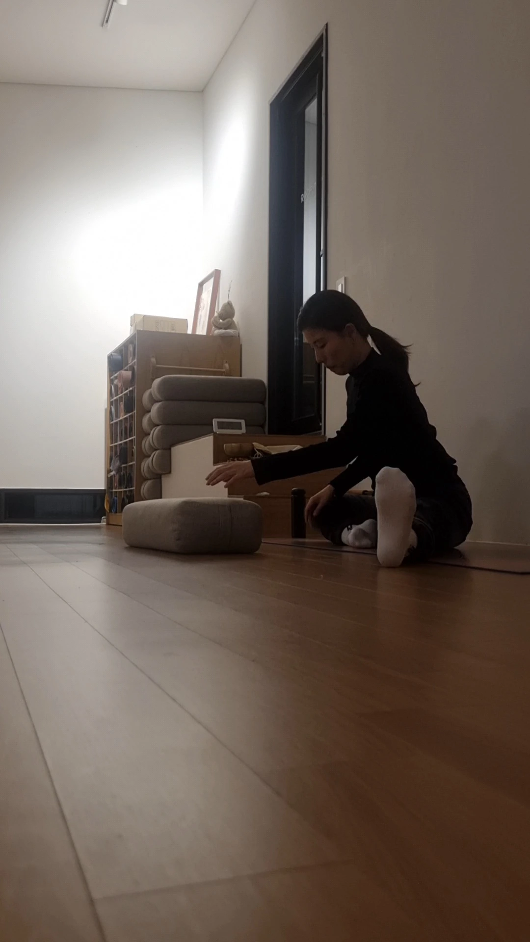 다리를 옆으로 열고는 상체를 바닥으로 내리려고 내적 비명을 지르고 있는 재은 님에게 다가가 어디가 불편한지 묻고, 상체를 기댈 수 있게 블록을 두 개 올려 그 위에 볼스터를 비스듬하게 세워줬다. 두 개 블록을 하나만 사용할지, 볼스터 높이를 더 올릴지 내릴지는 오늘 재은 님의 컨디션에 결정할 일이다.