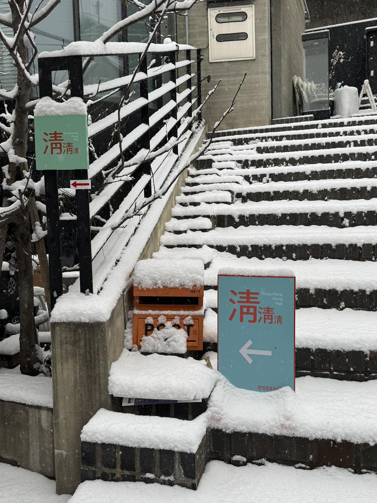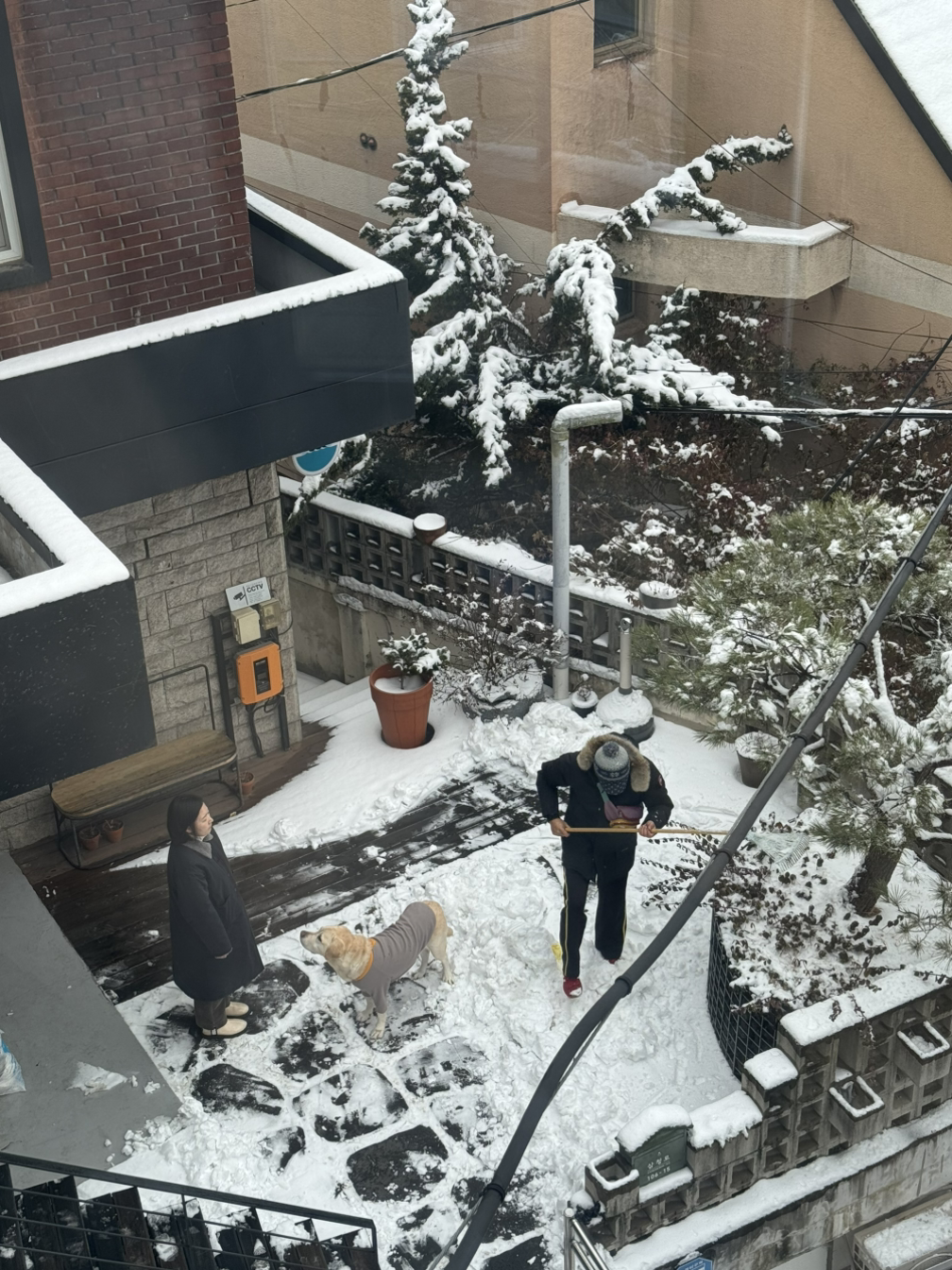강원도 평창 오대산 깊은 산장처럼 눈이 내리는 소리와 사람들의 숨소리만 들리는 서울 도심 속 작은 안식처에서 오늘은 눈은 바로바로 쓸어야 한다며 같이 빗자루와 쓰레받기를 들고 청청청으로 올라오는 길을 함께 정리해 주시는 삼청동에서 멀지 않지만 가깝지도 않은 평창동에서 오신 천사 유리님과 함께 하늘에서 내리는 예쁜 쓰레기를 치우며 역시 눈은 보기만 할 때 예쁘다는 것을 알아차리며 아침 11시 하타 요가 수업을 준비합니다.