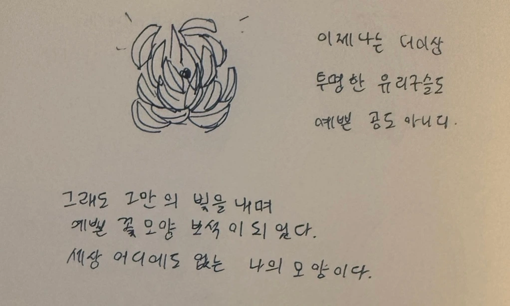 그래도 그만의 빛을 내며 예쁜 꽃모양 보석이 되었다. 세상 어디에도 없는 나의 모양이다.