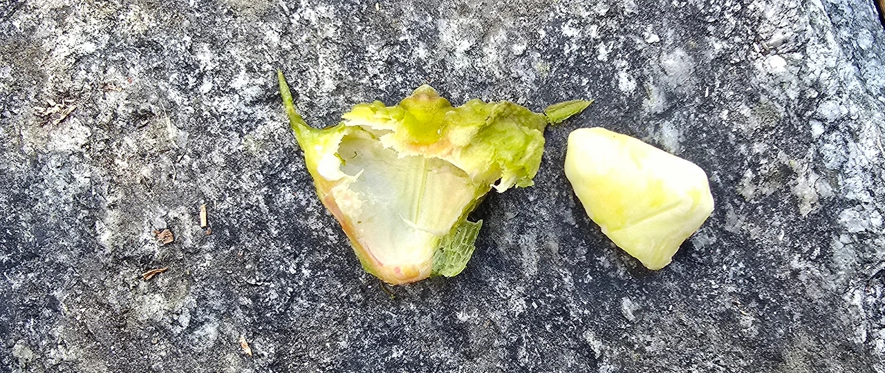 마름의 선택은 여기서 끝나지 않는다. 가시가 돋은 열매다. 마치 소의 뿔처럼 솟아있다. 이 가시는 물고기나 다른 동물이 쉽게 먹지 못하게 하는 방패이자, 진흙에 내려앉은 열매가 물결에 밀려 쉽게 떠내려가지 않도록 붙잡아 주는 작은 닻이었을 것이다. 오늘 마름을 찾으러 나온 이유도 이 열매를 만나기 위해서였다. 먹을거리가 충분하지 않은 시절에는 물밤이라고도 부르며 간식거리로 즐기고 때로는 허기를 달래는 요깃거리로 삼았다. 껍질을 벗겨 맛을 보니 아삭한 식감이 느껴졌다. 어릴 적에 먹었던 정확한 맛은 잊히고 없으나, 손끝에 느껴지던 날카로운 가시의 감촉과 논밭을 오가면서 보던 마름이 자라던 둠벙의 풍경은 지금까지 남아있다. 이 작은 열매 하나가 어린 시절로 되돌아가는 문이 되었다.
