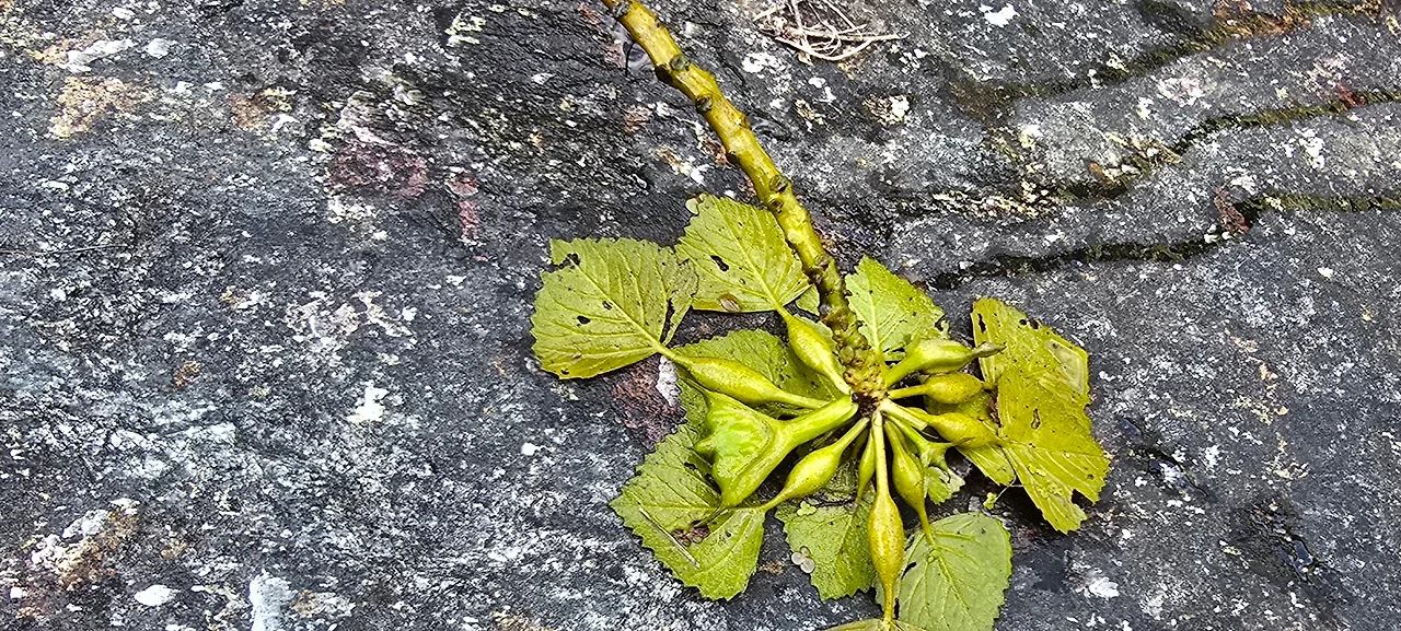 두 번째는 잎자루 중간 부분이 볼록하게 부푼 공기주머니다. 물속은 조금만 깊어져도 빛이 급격히 줄어들어 잎이 물속에 잠겨 있으면 광합성을 하기가 어렵다. 그래서 잎을 수면 위로 끌어올릴 장치가 필요했다. 바로 잎자루 속의 공기주머니다. 겉에서 보면 단순히 통통하게 부풀어 있는 것처럼 보이지만 그 안의 조직이 스펀지처럼 구멍이 많은 구조로 이루어져 있다. 이 크고 작은 방에 공기가 채워지면 부력이 생긴다. 물에 뜨는 구명조끼 원리가 마름의 잎자루 안에서 작동하는 셈이다.