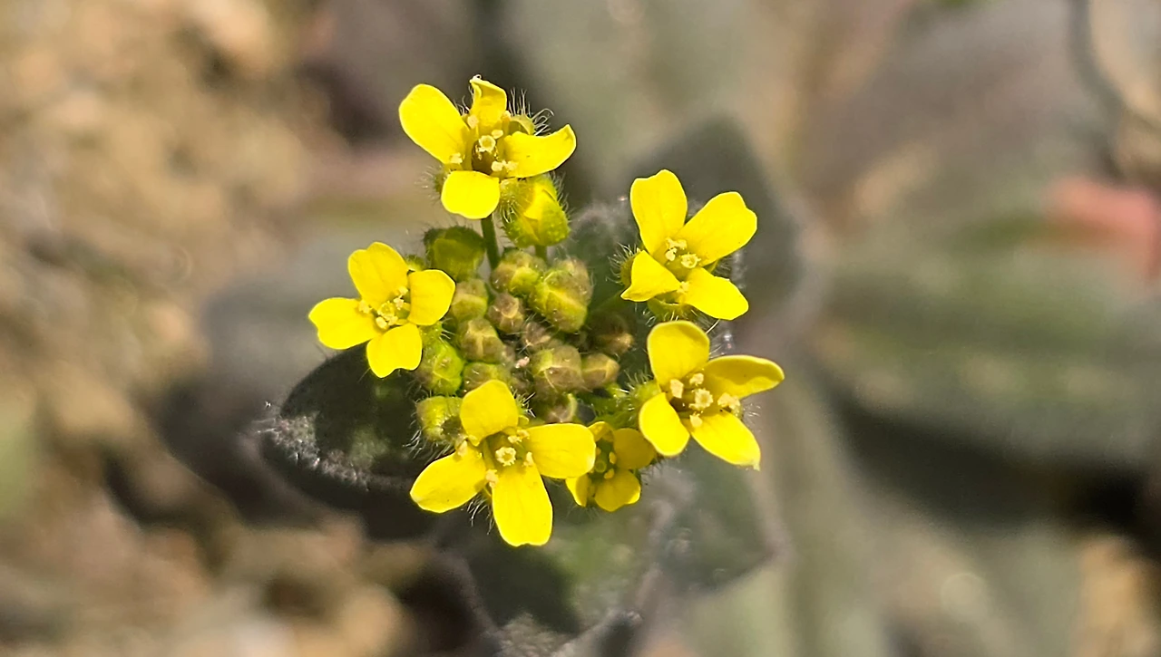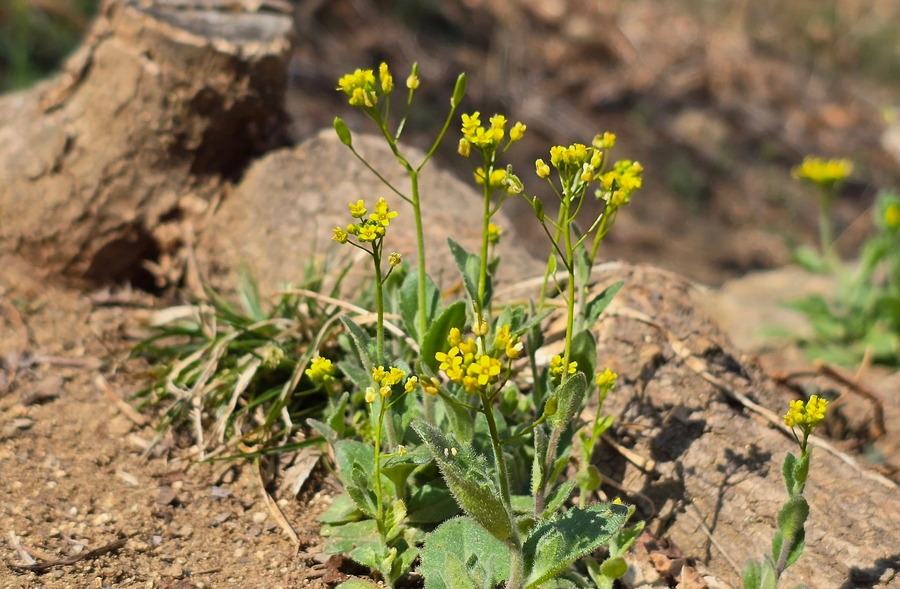 그가 떠나자 곧 꿀벌 한 마리가 날아왔다. 꽃에 앉으려 하자 여린 꽃줄기는 무게를 이기지 못하고 휘청이고 만다. 그러자 벌은 자리를 잡지 못하고 꽃잎을 붙잡은 채 대롱대롱 매달린다. 꿀 한 모금만 달라며 매달리듯 보인다. 이렇게 이른 봄의 꽃다지는 줄기도 여리고 꽃도 작다. 작은 꽃 여럿이 다닥다닥 모여 작지만 하나의 꽃다발을 이룬다.