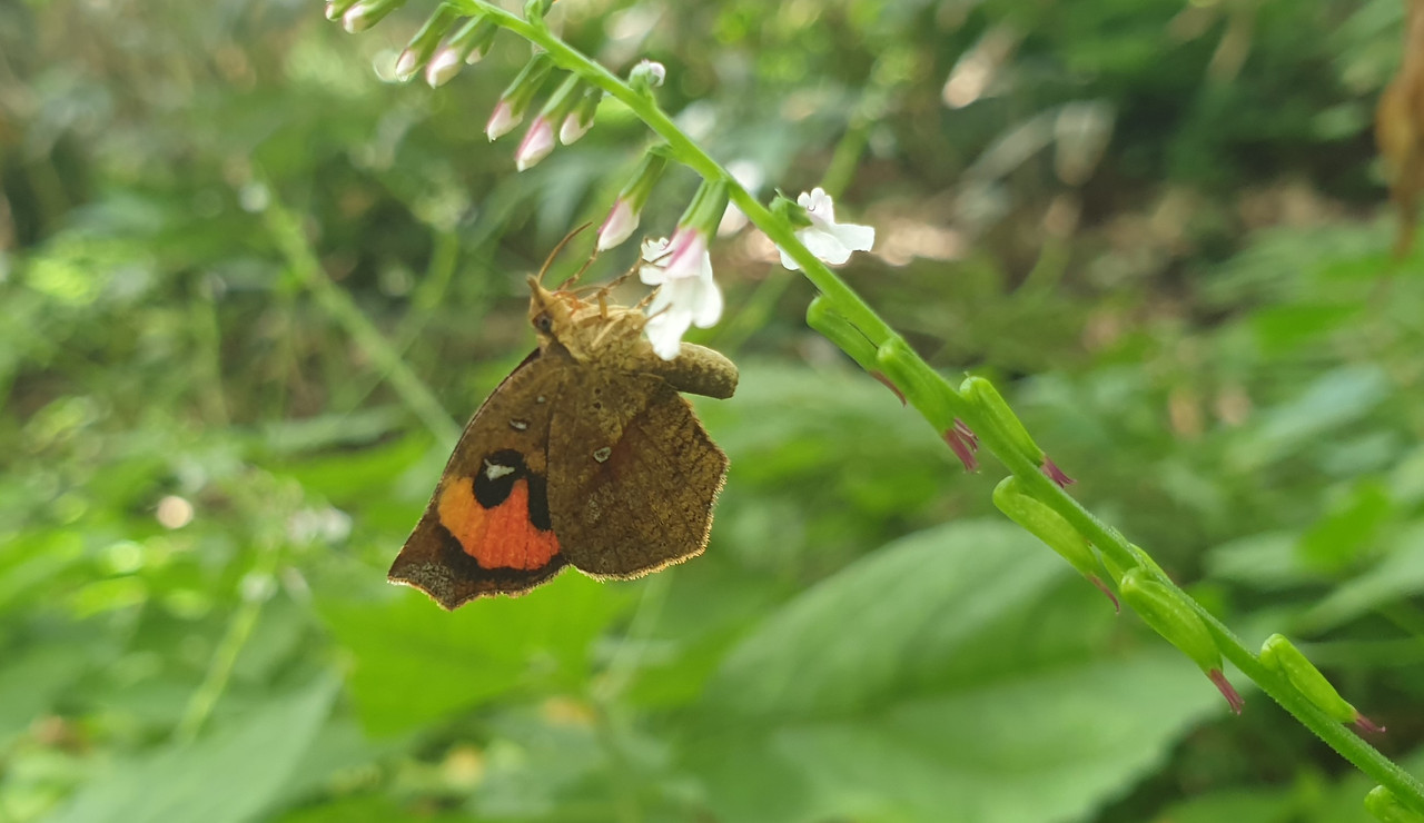 한참을 올라 능선길에 다다랐다. 다른 등산객도 긴 숨을 내쉬며 쉬어간다. 꽃은 작으나 붉은 꽃의 유혹이 강렬해 그냥 지나치기 어려운 이삭여뀌와 도둑놈의갈고리가 쉼터 주변에 드문드문 보인다. 경사길을 오르면서도 이 붉은 유혹에 끌려 꽃을 보며 가쁜 숨을 골랐다. 뿌리를 찧어 나온 즙으로 파리를 잡는다는 파리풀이 많다. 파리풀꽃만 찾아 꿀을 빠는 나비가 있다. 생김새와 낮에 활동하는 습성이 영락없이 나비인데 찾아보니 뿔나비나방이다. 다음에 만나면 이름을 불러줄 수 있게 잘 기억해야겠다.