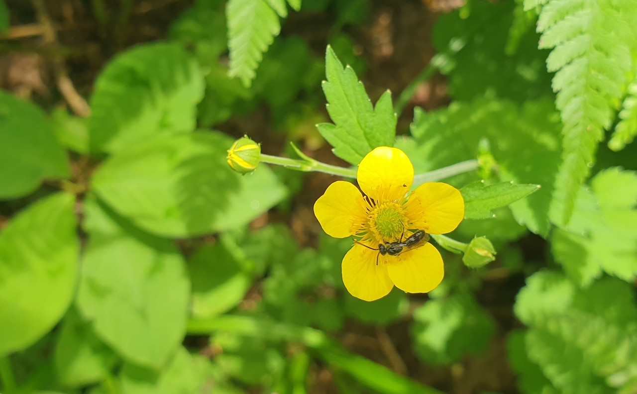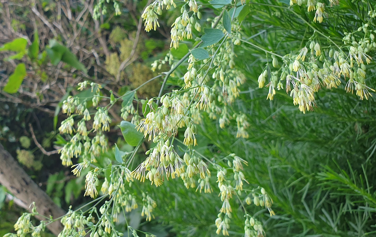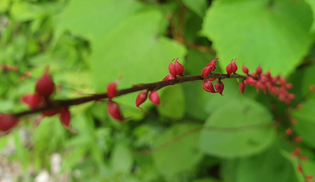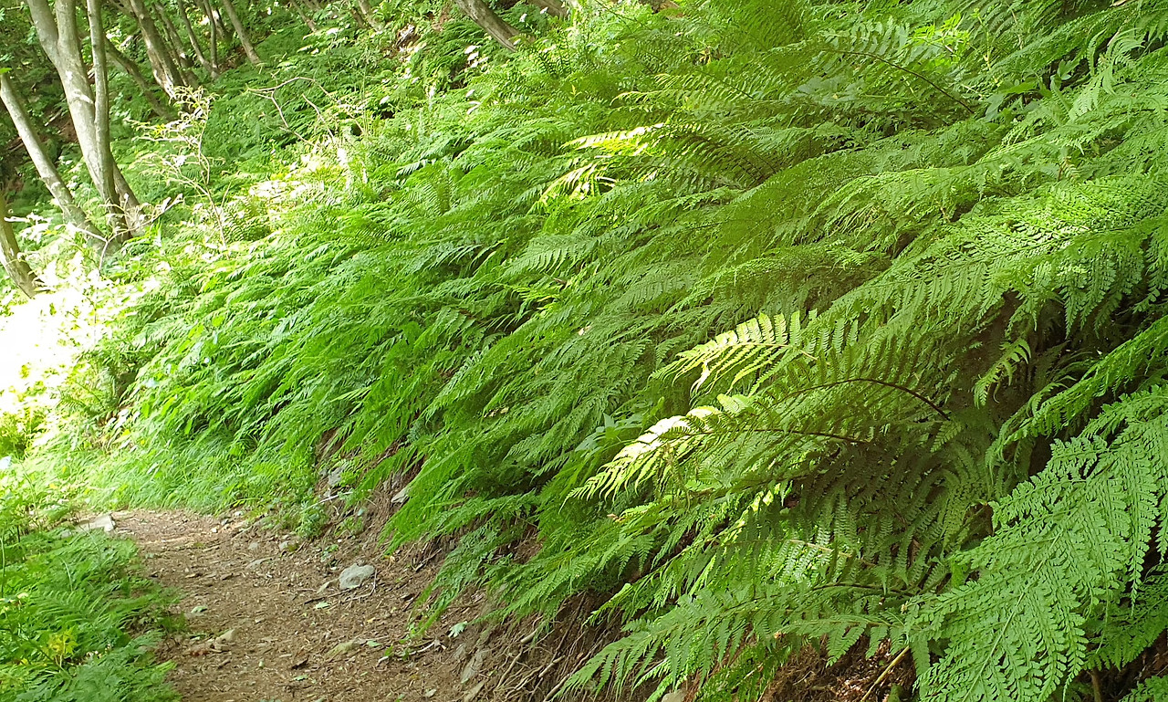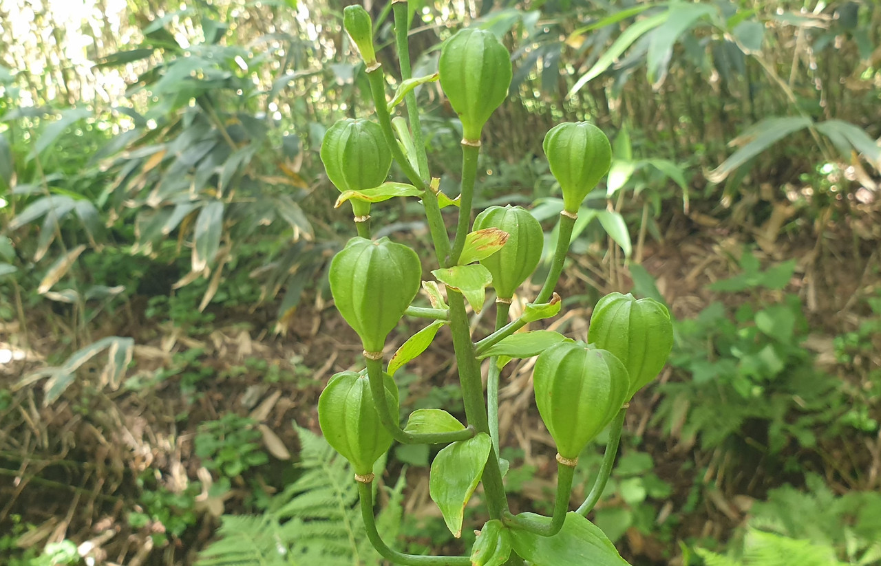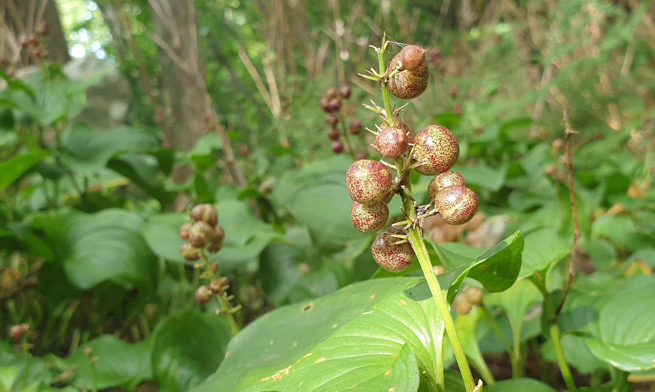 가파른 경사를 얼마간 오르니 산비탈을 옆으로 지나는 길 좌우에는 고사리류, 관중, 고비 같은 양치류가 지면을 뒤덮었다. 이색적이다. 한 여름이라 꽃이 많진 않으나 그 자리에 열매가 익어가고 있다. 큰두루미꽃은 갈색 점이 박힌 둥근 열매를 키우고 섬노루귀, 큰연영초와 섬말나리도 큰 잎을 펼치고 열매를 달고 있다. 꽃이 아니어도 충분히 풍경이 된다.