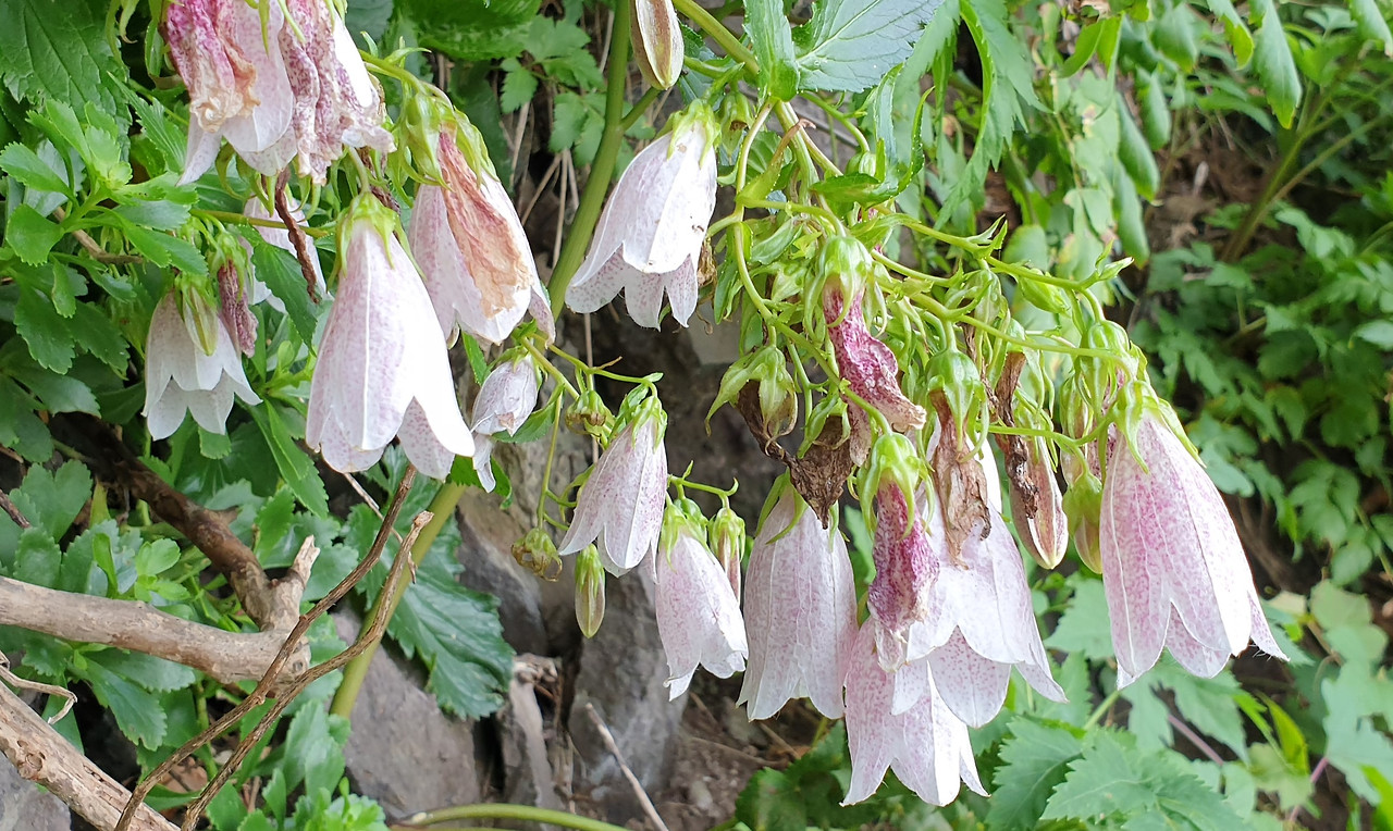능선길에서 만나는 섬초롱꽃은 즐거움이다. 해안 절벽에는 군락을 이루기도 하나 여기서는 한두 개체가 드문드문하다. 근연종인 초롱꽃과 비교하여 잎이 두껍고 줄기에 털이 없으며 꽃 안쪽에 자주색 반점이 많다는데 차이를 비교해 알아보기는 쉽지 않다. 금강초롱꽃을 만나기 위해 설악산 공룡능선을 걸었던 오래전 기억이 불현듯 떠올랐다. 산에서 만나는 초롱꽃은 언제나 감동이다.