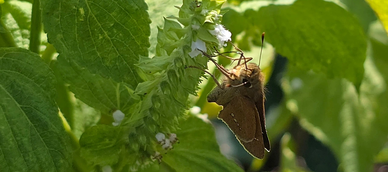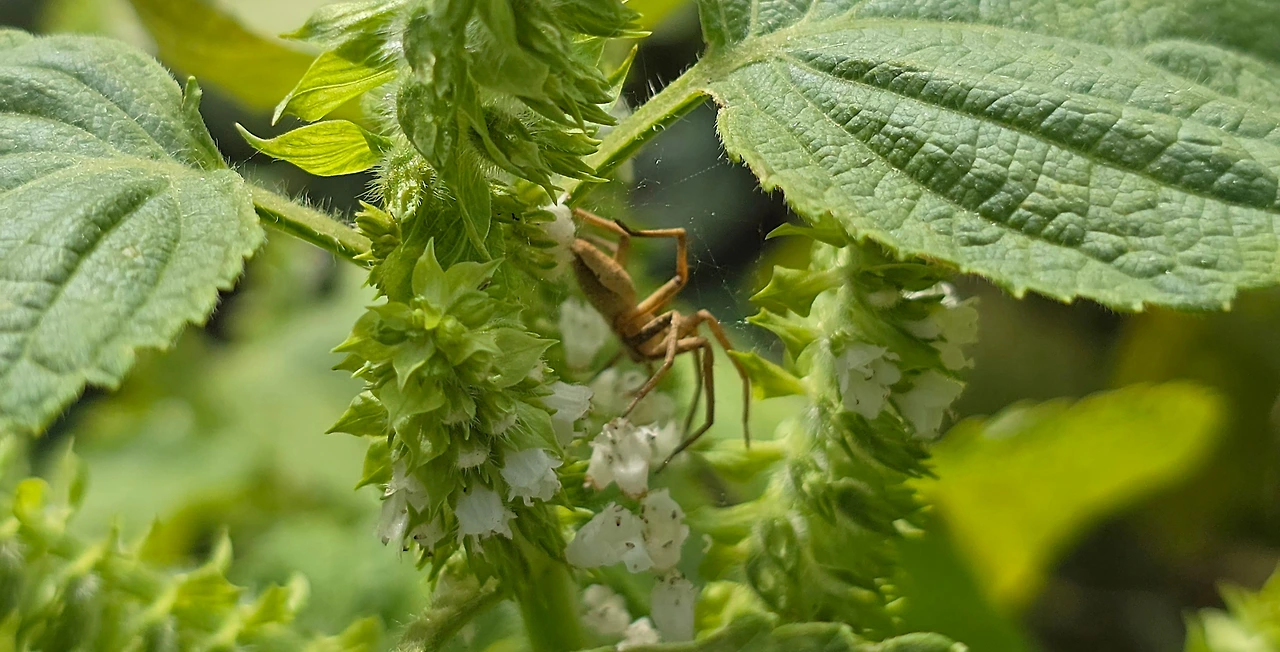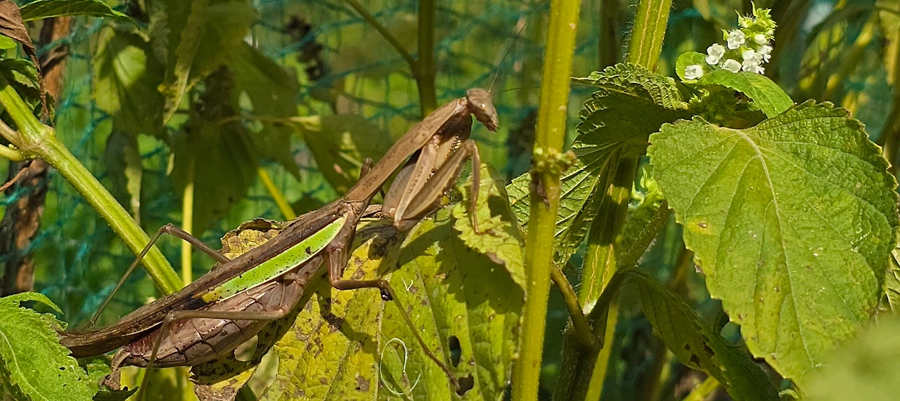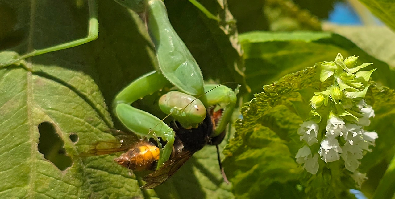 꽃에도 많은 곤충이 찾아온다. 들깨꽃이 한창일 때 잠시만 지켜봐도 벌, 나비, 꽃등에, 파리 같은 다양한 곤충이 온다. 그만큼 향기가 진하고 가져갈 꿀이 많다는 방증이다. 곤충이 많이 오는 사실을 사마귀도 알아챘다. 꽃 근처에서 꼼짝없이 인내하며 은밀하게 사냥할 기회를 엿본다. 먹이가 사정거리 안에 들어왔을 때 앞다리를 뻗어 단박에 낚아챌 요량이다. 그 순간을 보고 싶었으나 내 인내심은 금방 바닥이 난다.