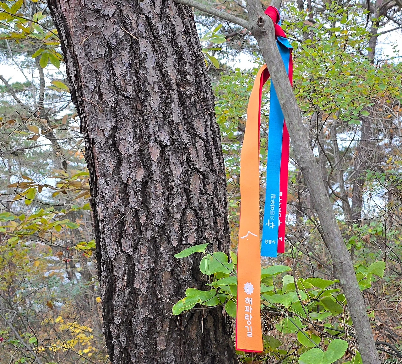 이른 잠 덕분에 아침에 일찍 일어나 해맞이도 할 겸 뒷산에 오른다. 식물들 간섭하느라 걸음이 느려지는데도 친구는 말없이 기다리며 앞서간다. 어젯밤에 소리로 듣던 바다를 해발 343m 괘방산에서 내려다본다. 배가 지나간 흔적을 길게 남기며 바다는 저녁과 달리 순하다. 해뜨기에 아직 이른 시간이고 구름도 많아 일출은 볼 수 없다. 능선길에 해파랑길 표지와 리본이 있다. 은퇴하고 가장 먼저 하고자 했던 해파랑길 걷기가 이유 없이 미뤄지고 있는데, 표지를 보니 다시 마음이 동한다.
