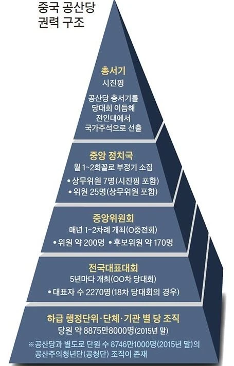 시진핑과 같은 중국의 엘리트 지도층들은 아래부터 하나하나 단계를 밟으며 높은 자리로 올라온 사람들이다. 중국 공산당의 피라미드 구조를 한번 간단히 살펴보자.