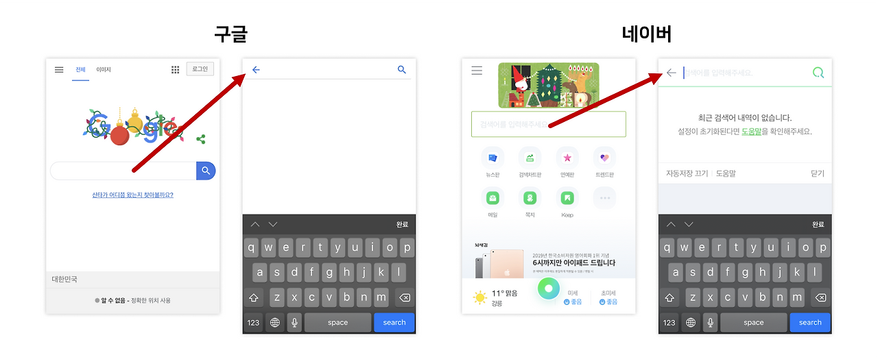 구글과 네이버 모두 검색창을 누르면 텍스트 입력 화면으로 이동한다. 그리고 위 이미지처럼 텍스트 입력 화면에서 입력창은 화면 최상단에 있다. 이런 방식의 장점은 어느 브라우저 환경에서든 입력창이 키보드에 가려지지 않는다는 것이다. 또한 입력창과 키보드 사이의 남는 공간에 추천/최근 검색어 정보를 제공해줄 수도 있다.