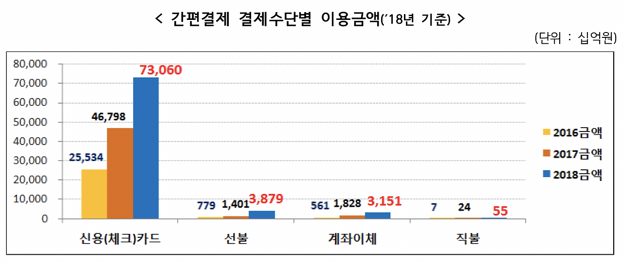 최근엔 네이버페이, 카카오페이 등의 간편 결제도 많이 사용되긴 한다. 하지만 간편 결제에 연동된 결제 수단이 결국 신용카드/체크카드라는 점을 잊어서는 안 된다. 18년 금감원 자료에 따르면 간편 결제 이용 금액 중 91%를 차지하는 것이 신용카드를 연동한 결제다.