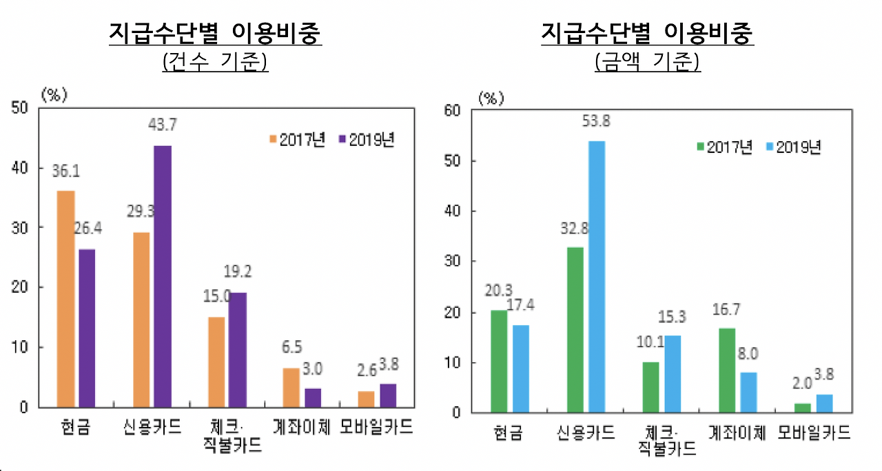 오프라인 결제는 말할 것도 없고 온라인 결제에서도 카드사는 맹위를 떨치고 있다. 19년 한은 발표 자료에 따르면 사람들은 온라인에서도 신용카드를 가장 많이 쓴다.