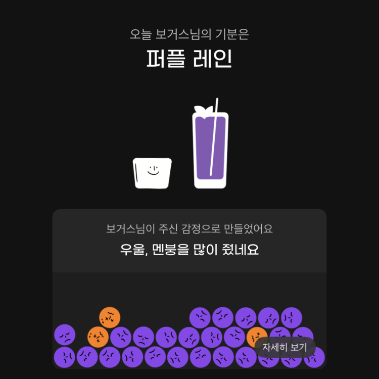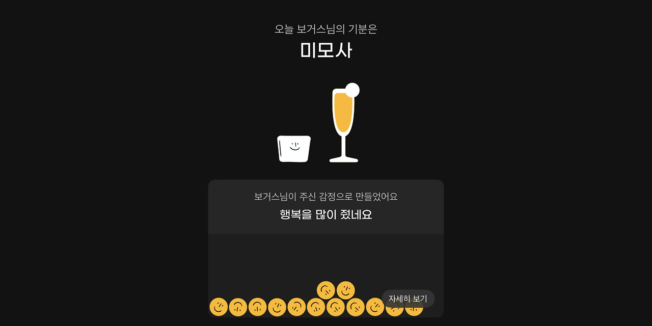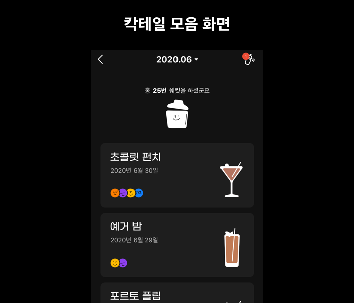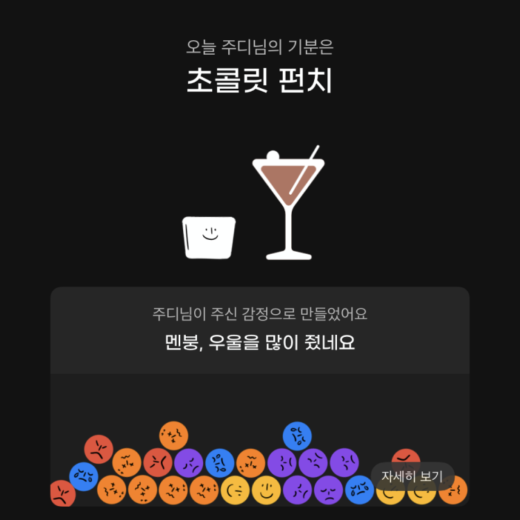 위와 같은 정보를 화면 상단에서 공유하기 좋게 잘 구성해서 보여주면 어떨까 싶다. 또 한 달 동안 쌓인 감정 데이터를 바탕으로 월말에 '이 달의 칵테일'을 주는 것도 재미있을 것 같다.