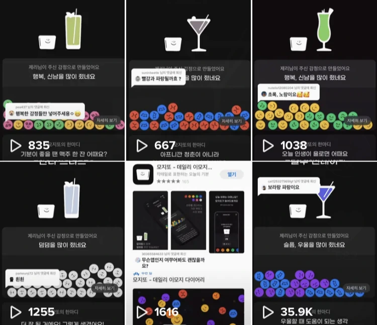 누군가 댓글로 슬픈 감정 넣어주세요! 하면 슬픈 이모지로 칵테일 만드는 영상을 찍어 올리는 식이다. 모지또로 이런 콘텐츠를 만들 생각을 하다니 정말 대단하다 생각했다.