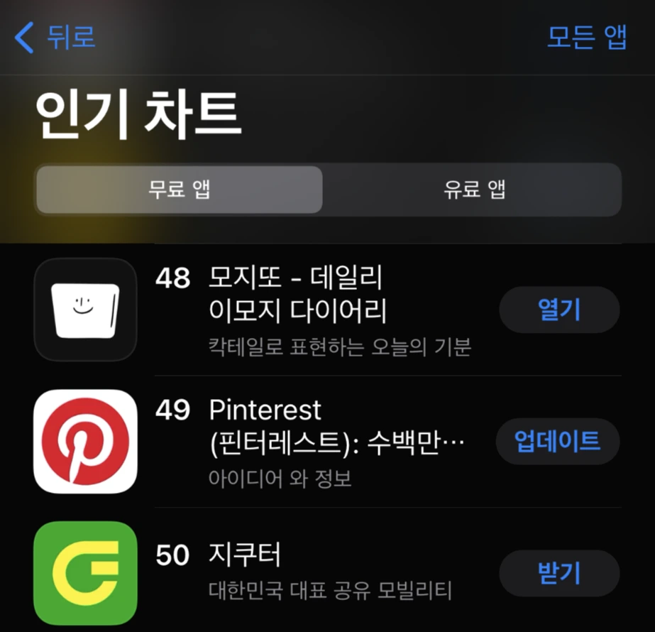 틱톡 바이럴이 끝나고 얼마 후 모지또 앱 순위가 치솟은 적이 있었다. 어어.. 어디까지 올라가는 거야? 하다가 무료 전체 앱 순위 48위까지 올라갔다.