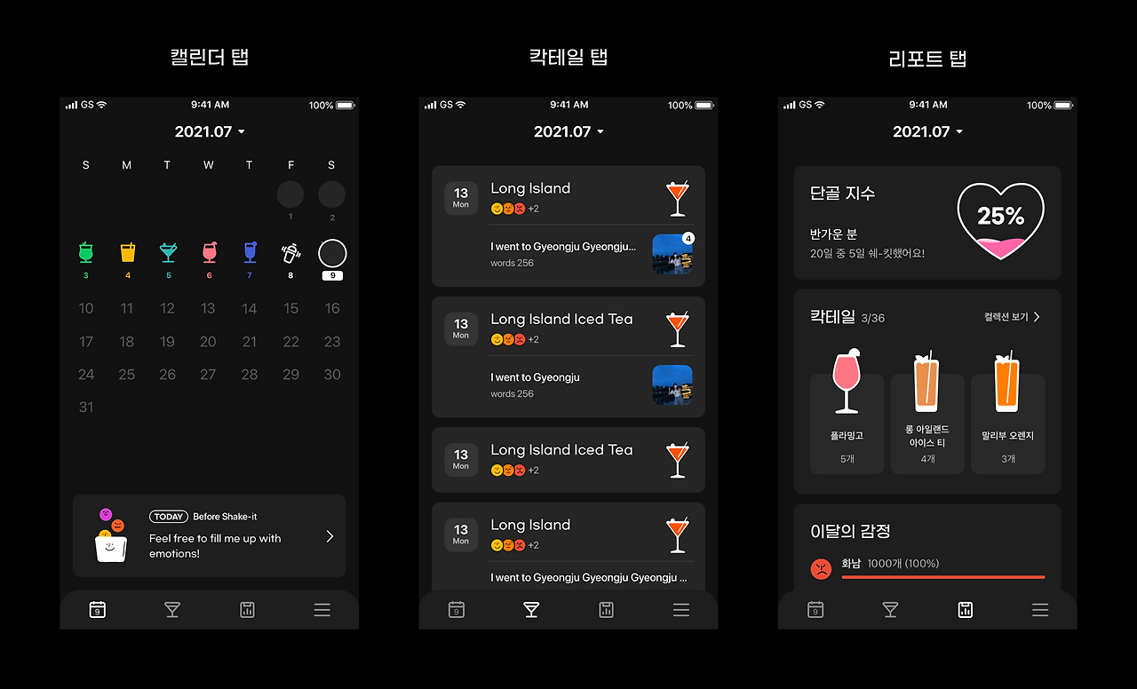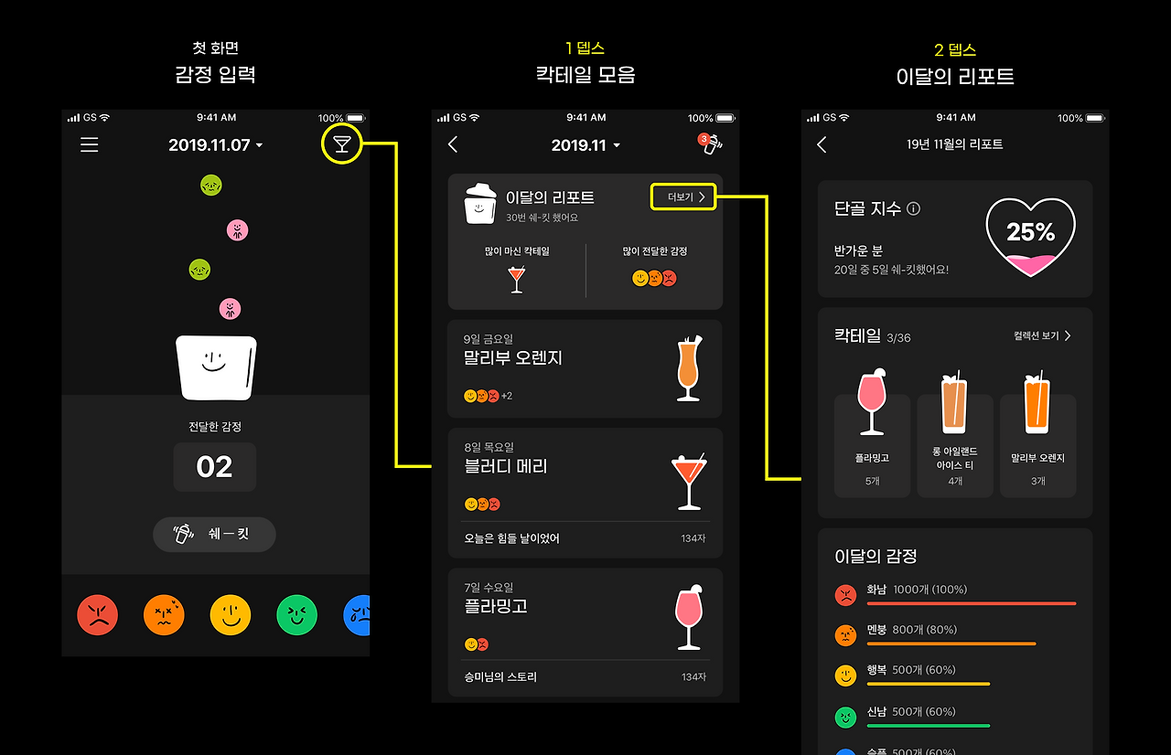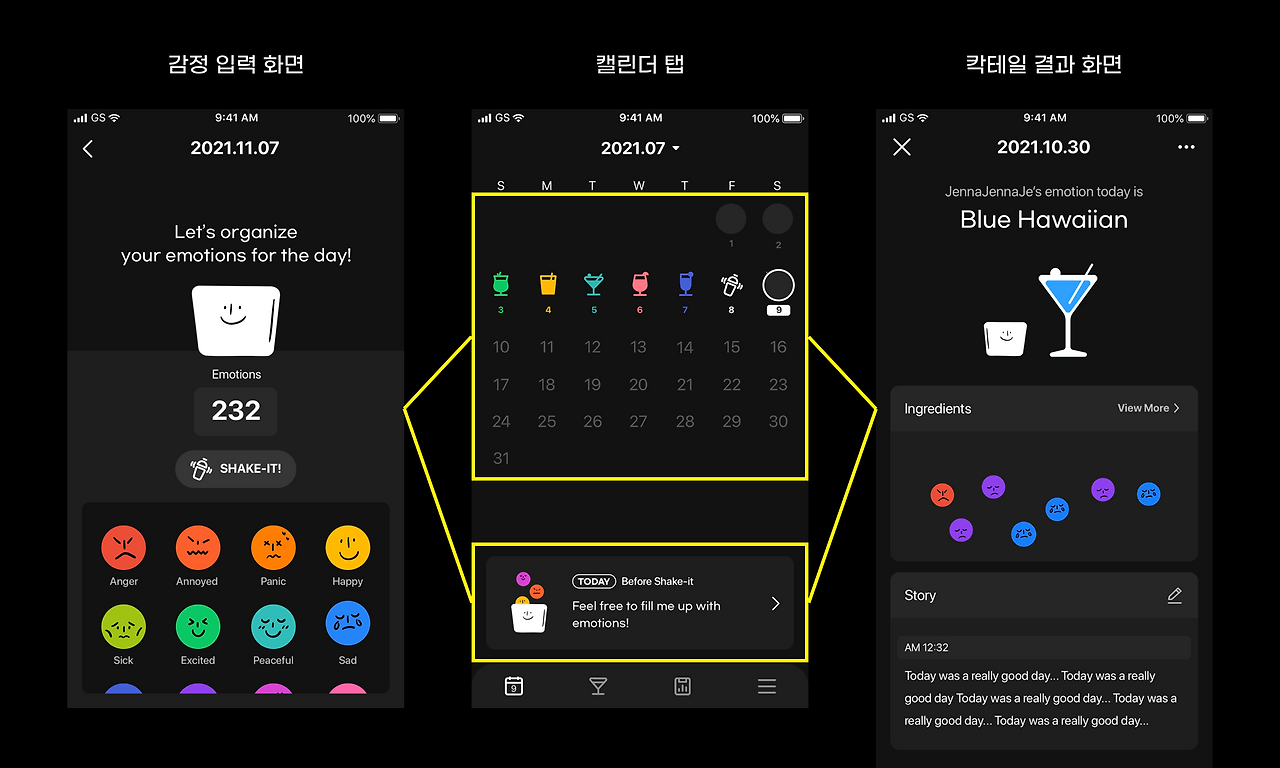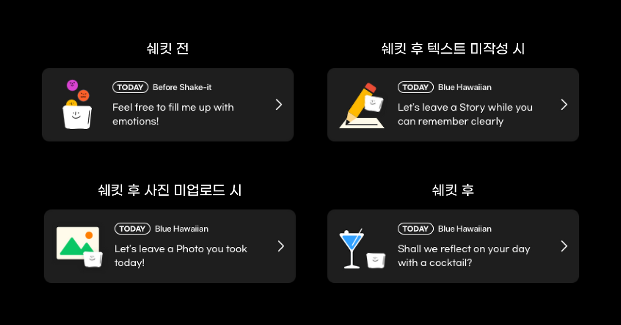 감정 입력을 완료하고 쉐-킷을 하면 첫 화면이 칵테일 결과 화면으로 변경되는 식이다. 사용자가 보다 더 쉽게 감정을 기록하고 결과물을 확인할 수 있도록 위와 같이 첫 화면을 구성했다.