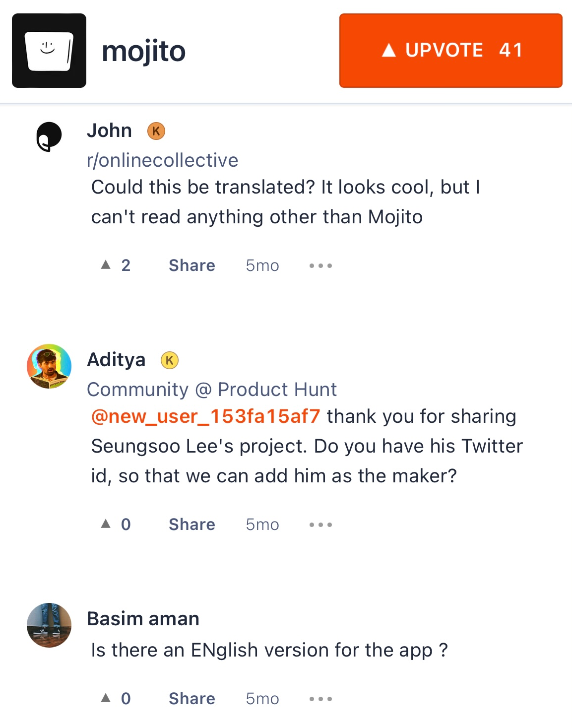 또 이런 욕망에 기름을 부은 건 지인이 모지또를 프로덕트 헌트에 올린 일이었다. 시험삼아 모지또를 올려봤는데 사람들에게 귀여운 관심을 받았다.