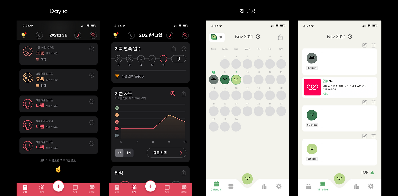 앱에 들어와서 바로 감정을 입력할 수 있는 나름의 장점을 가진 구성이었다. 하지만 앞서 말한 것처럼 장기 보상 측면에서는 아쉬운 점이 있었다.