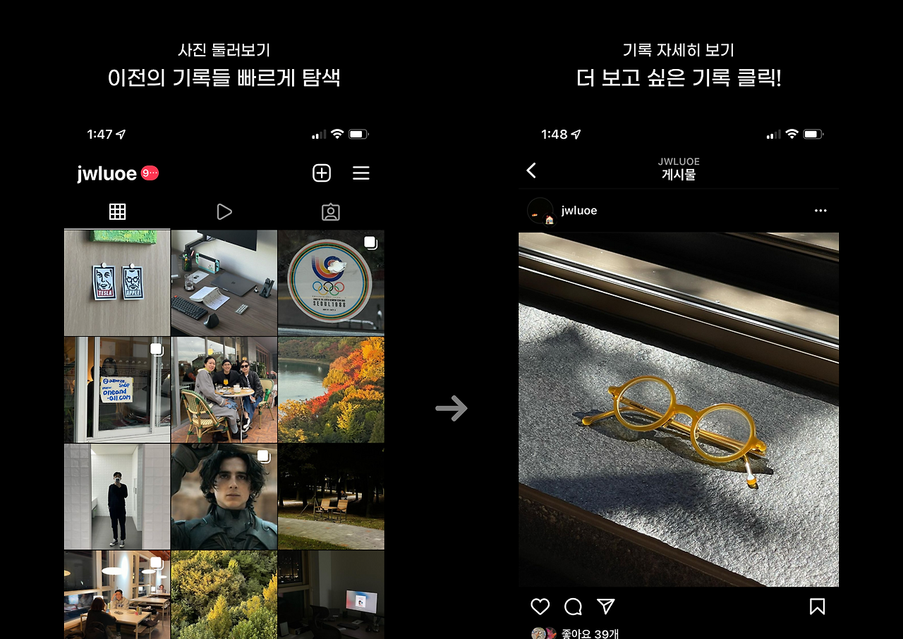 그리고 이전에 남긴 기록들을 돌아볼 때도 텍스트보다는 사진이 더 눈에 잘 들어왔다. 유튜브 영상의 썸네일 같은 느낌이라고 할까? 어떤 날의 기록을 더 자세히 볼지 말지 결정할 때 사진은 큰 역할을 했다.