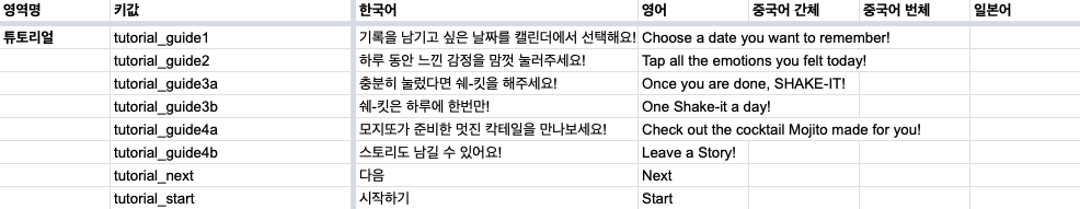 첫 번째는 어렵지 않게 해결했다. 번역된 내용을 구글 시트에서 키값으로 관리하기로 했다. 하나의 번역 요소마다 키값을 부여하여 언어별로 매핑하는 식이었다.