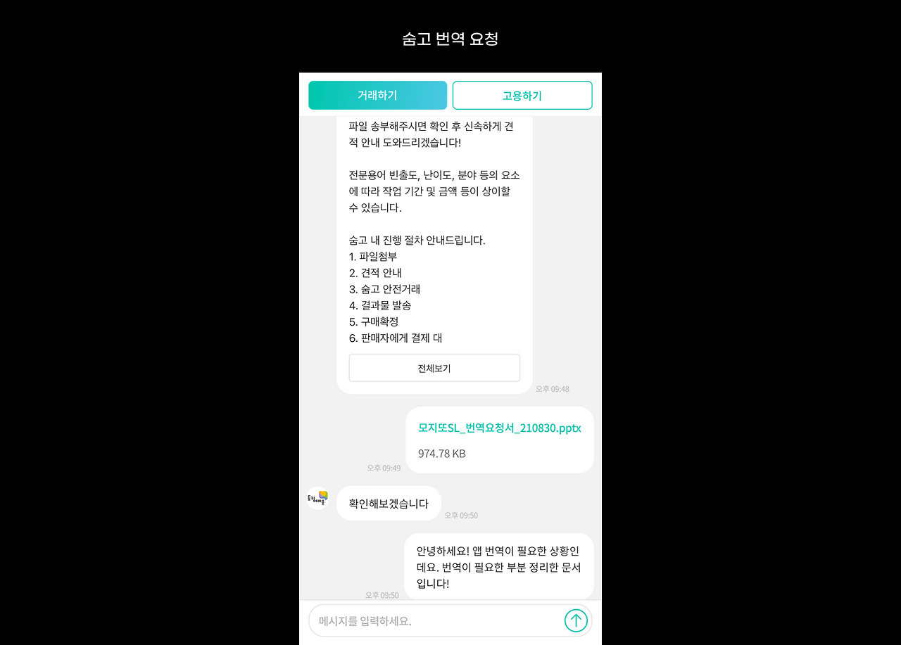 이번에 모지또는 영어, 중국어 간체/번체, 일본어를 제공하는데 영어를 제외하고는 모두 숨고로 번역 의뢰를 했다. 번역이 필요한 내용과 함께 요청을 하면 여러 업체에서 견적을 내줬다.