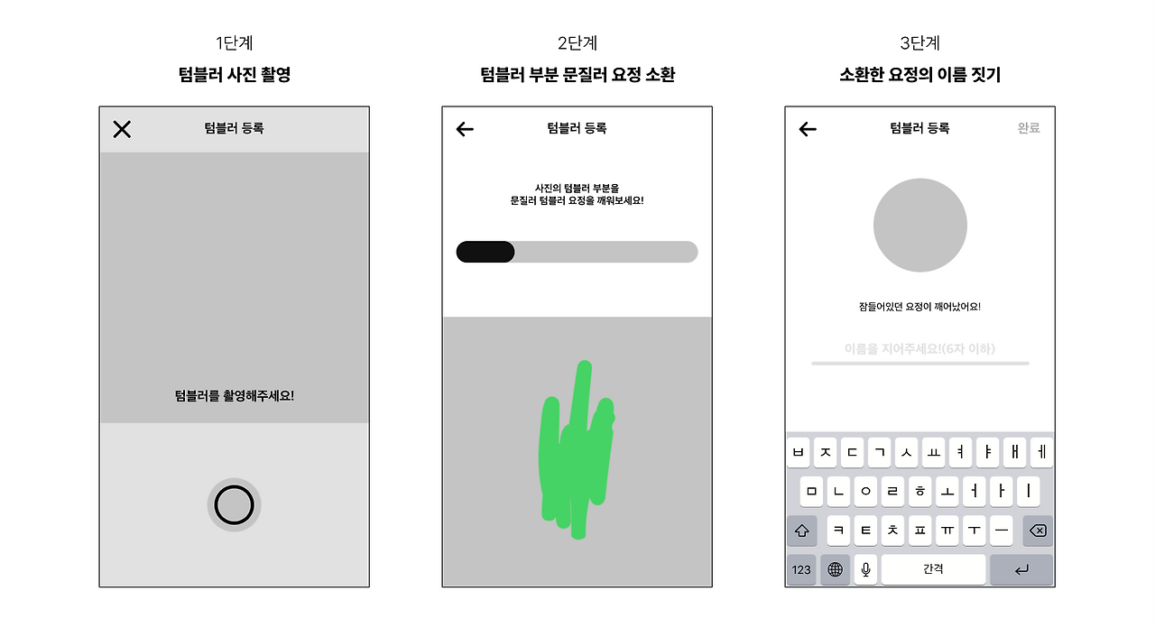 그래서 곧바로 앱 기획에 녹였다. 아무래도 텀블러의 요정을 소환하는 것이라 텀블러 등록 과정에 컨셉을 입히는 것이 좋았다.