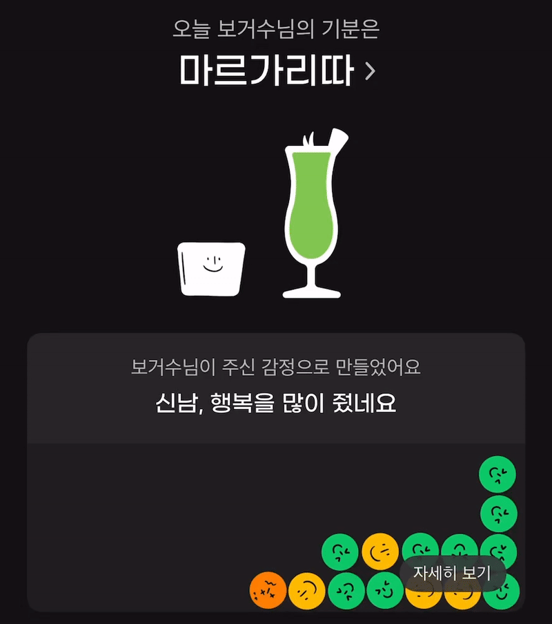 조금 더 재밌게 표현할 방법은 없을까 고민을 하다 모지또의 한 인터랙션이 떠올랐다. 디바이스를 흔들면 그에 맞춰 사용자가 남긴 감정 이모지들이 화면 안에서 굴러다니는 인터랙션이었다.