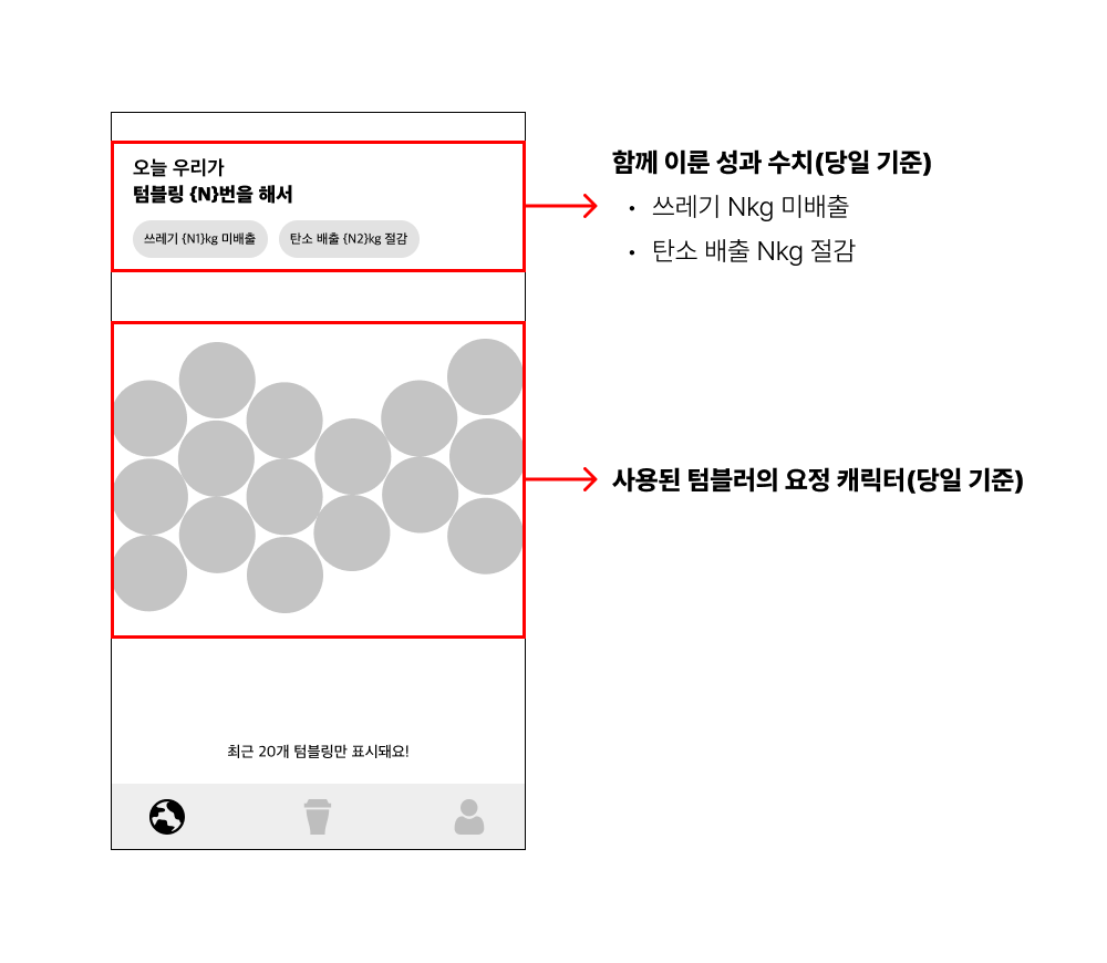 그리고 텀블링 완료 화면을 닫으면 자신의 텀블러 요정이 텀블러 사용 대열에 합류한 모습을 보여 주기로 했다. 이 또한 사용자에게 보람으로 작용할 수 있을 것이라 봤다.