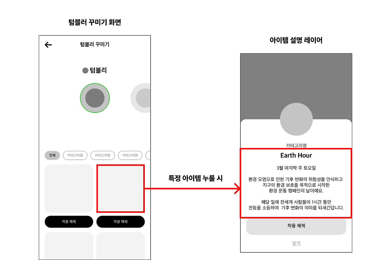 아이템 기능은 위의 문제를 해소해 줄 요소였다. 아이템이 있다면 사용자는 자신의 텀블러 요정을 개성있게 꾸미는 게 가능했다.