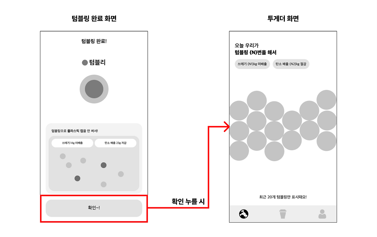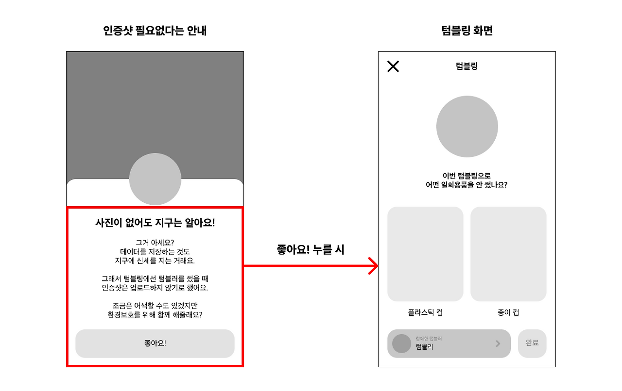 그리고 텀블링 화면에는 인증샷 업로드 대신 텀블러 사용으로 안 쓴 일회용품을 선택하는 기능을 넣었다. 플라스틱 컵과 종이 컵 중 하나를 선택하여 완료 버튼을 누르면 텀블링 과정이 끝났다.