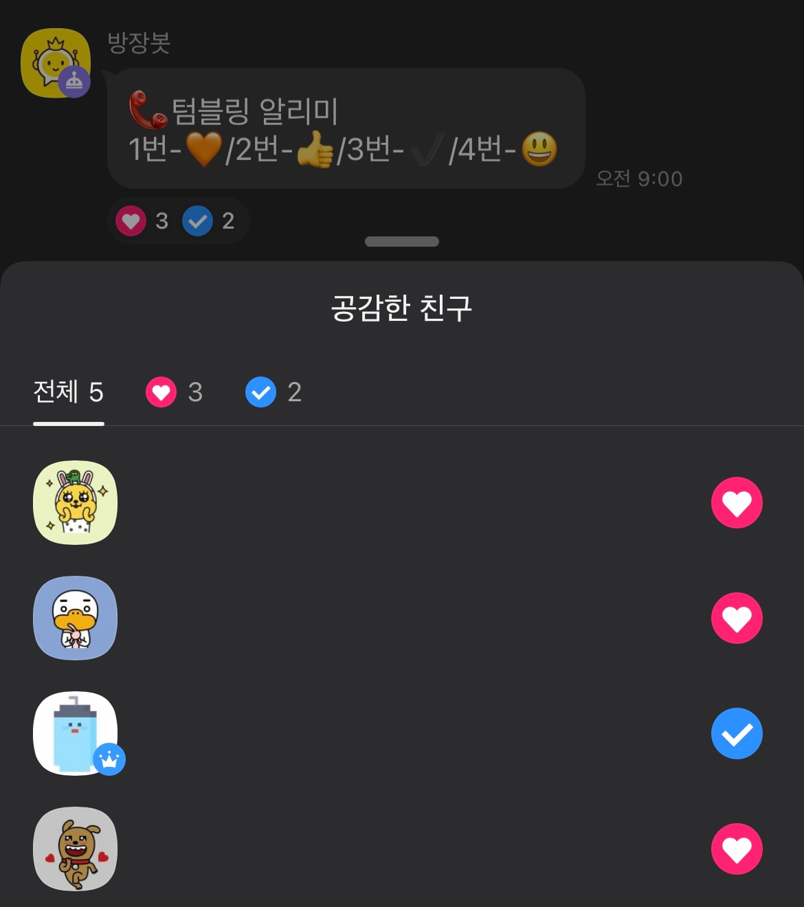 그래서 텀블링 챌린지의 일부 그룹엔 사진 없이 텀블러 사용을 인증하도록 가이드했다. 텀블러를 사용하면 단톡방의 방장봇 메시지에 공감 반응을 다는 식이었다.
