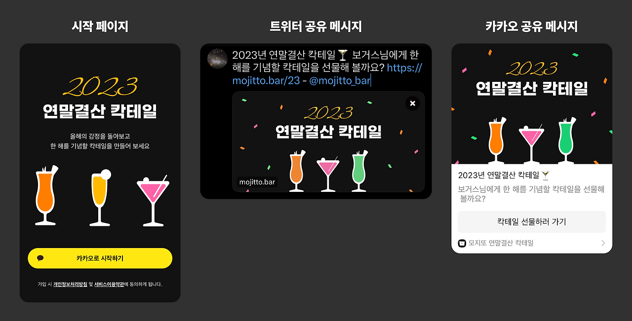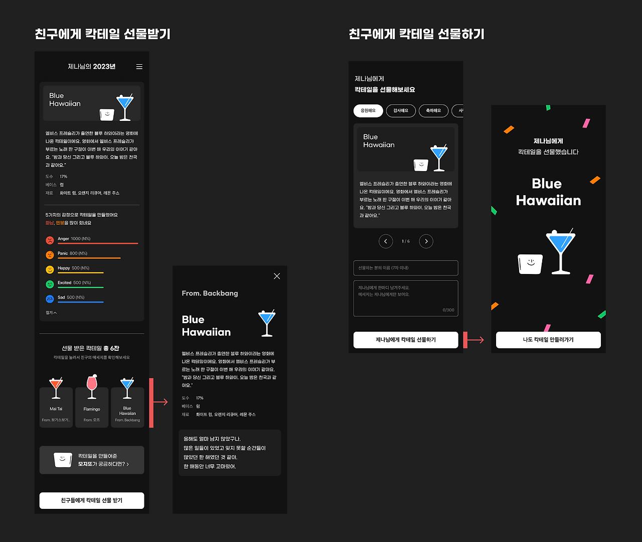 위와 같은 고민의 과정을 거쳐 2023 연말결산 칵테일 페이지가 완성되었다. 위에서 말한 것과 같은 흐름의 서비스다.