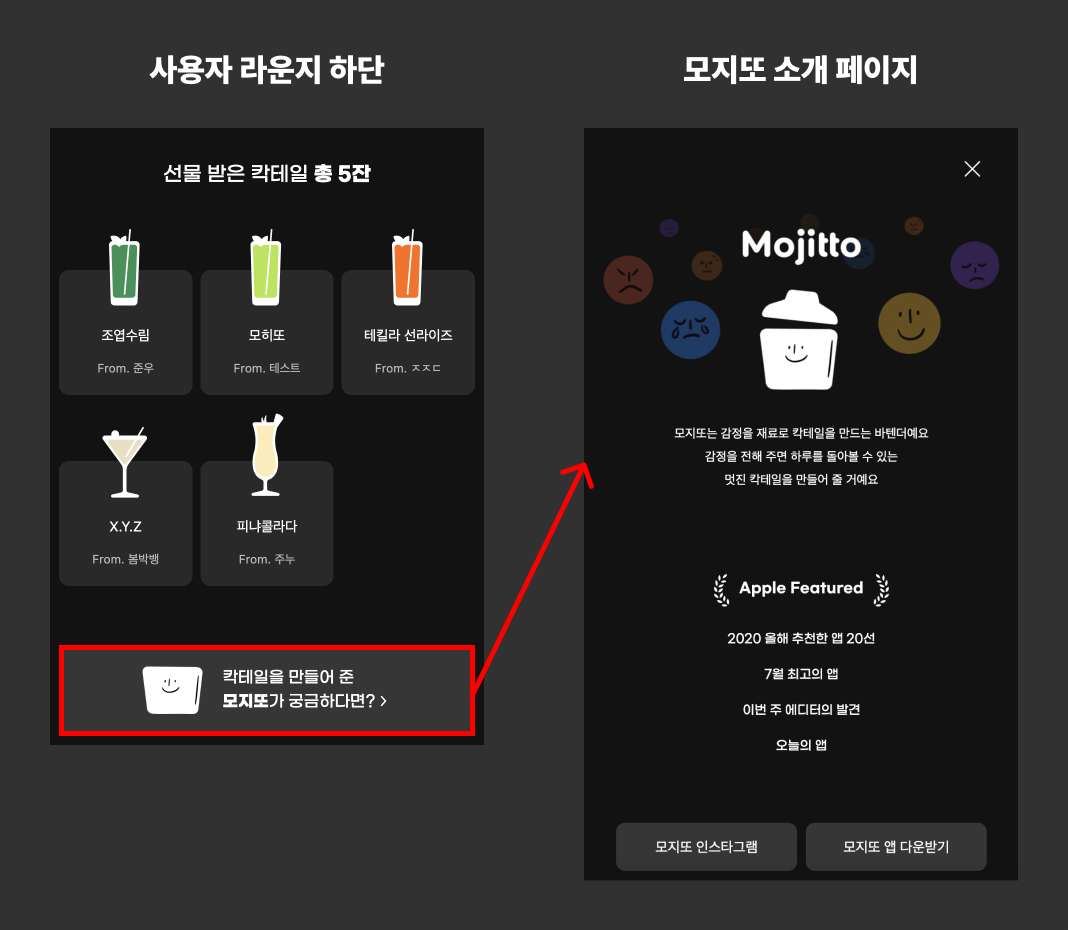 서비스 내 주요 화면 그리고 바이럴의 접점이 되는 곳에서 모지또 대신 칵테일을 중심으로 보여 줬다.