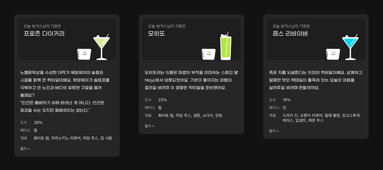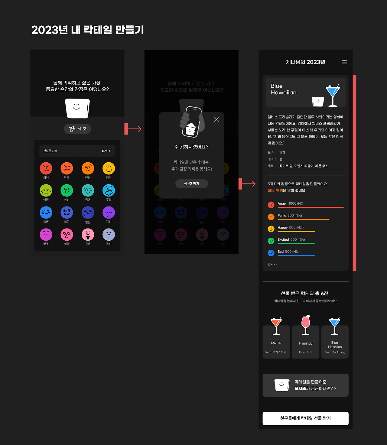 이러한 모지또의 강점을 연말결산 페이지에서도 활용하기로 했다. 모지또는 한 해 동안 손님이 느낀 기분에 알맞은 칵테일을 만들어 준다.