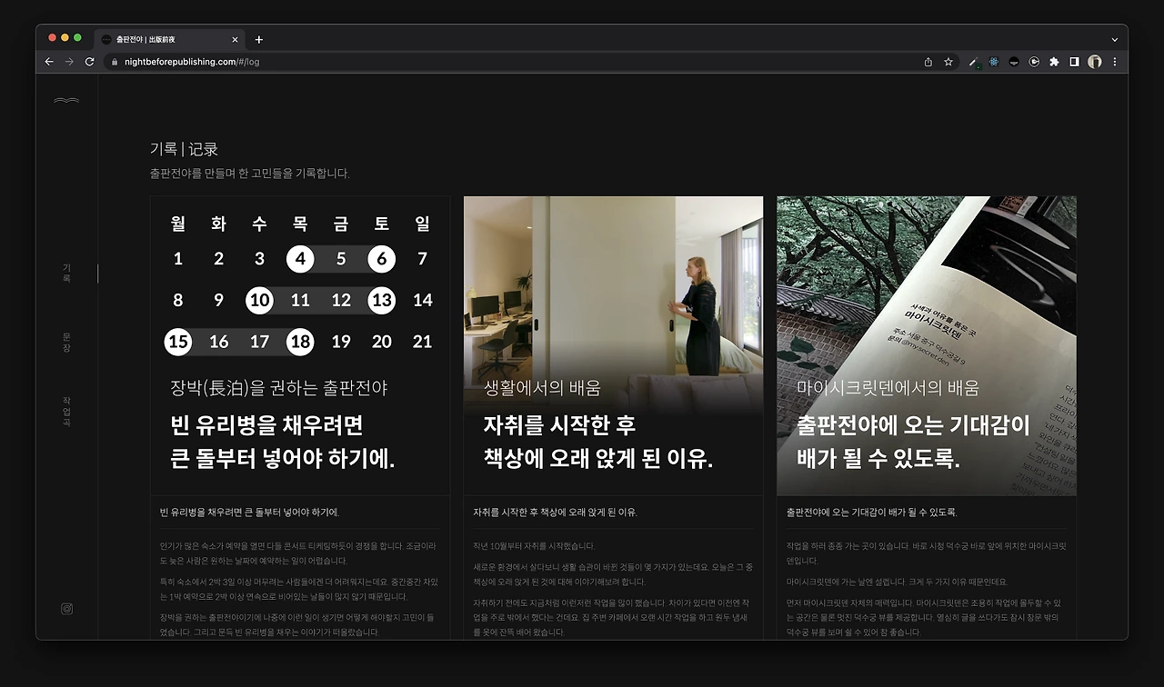 이 웹사이트에다 출판전야 관련 콘텐츠를 아카이빙하기로 했다. 출판전야가 완성되면 손님과 상호작용할 수 있는 온라인 채널로도 쓸 수 있었다.