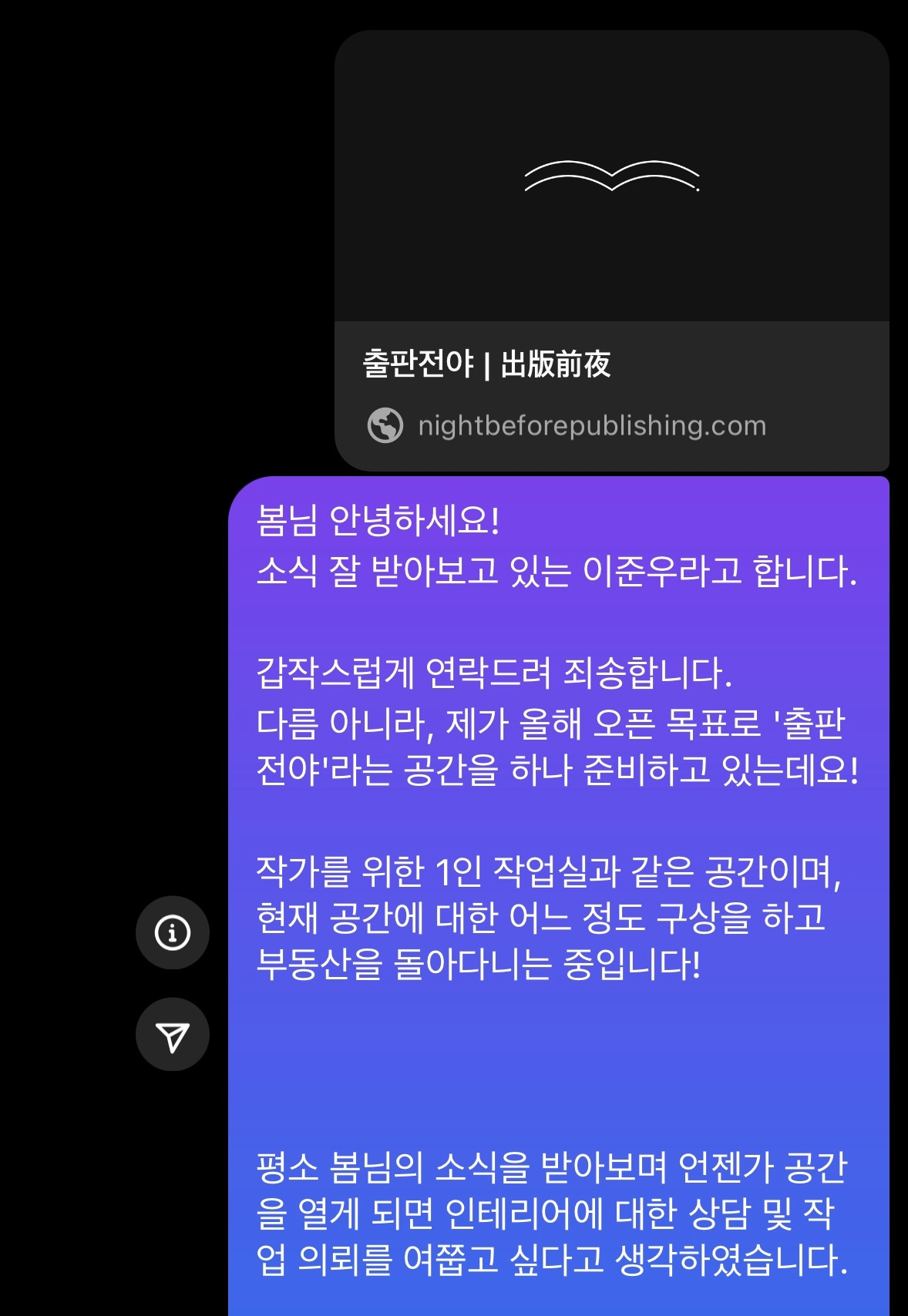 출판전야가 예술가를 위한 장소인 만큼 예술가와 만들고 싶다는 생각이 컸다. 용기를 내서 디자이너 님에게 DM을 보냈다.