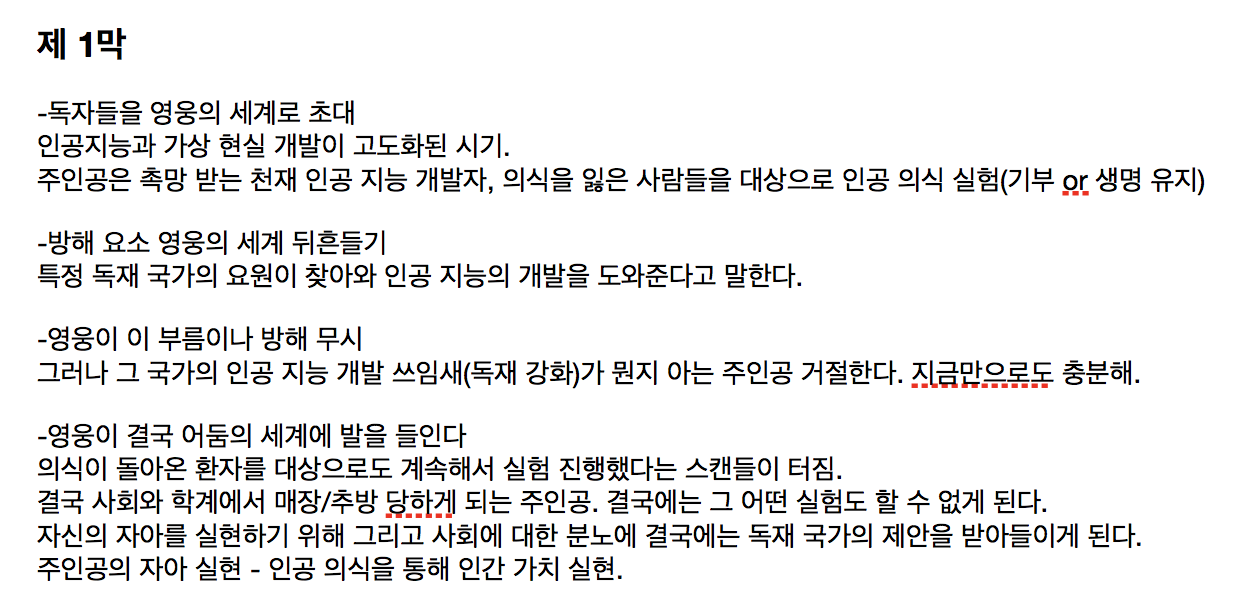 최근에 쓴 초신성이라는 소설의 1막 부분 구성이다. 일단 짧게 한 두 문장 정도로 플롯에 상상을 채워 넣었다. 그냥 자기만 알아볼 수 있는 수준으로 짧게 정리하면 된다.