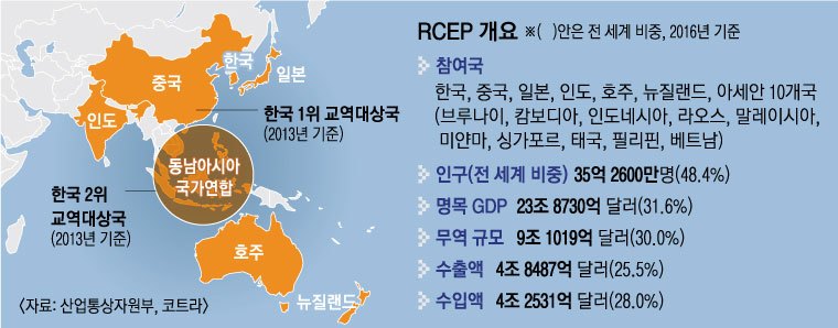 17년 기준 RCEP 회원국의 인구 총합은 전 세계 인구의 49%인 약 36억 명 정도며 GDP 총합은 전 세계 GDP의 약 32%인 25조 달러다. 수치상으로 봤을 때 세계에서 가장 큰 규모의 경제권인 것이다.