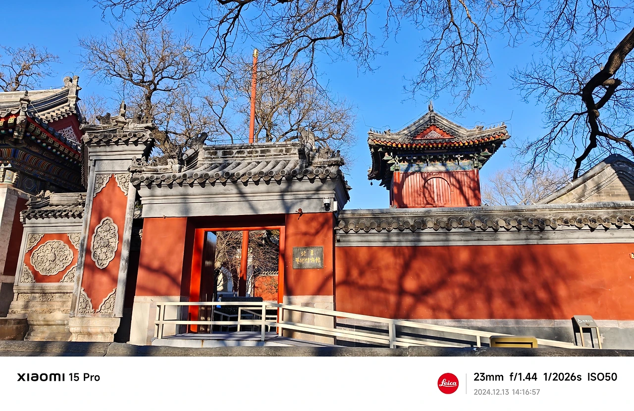 万寿寺 남문, 현재는 북경예술박물관 간판을 걸고 있다. 황제를 상징하는 문양과 붉은 담벼락.