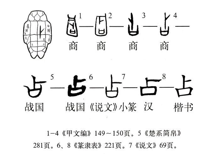 점(占)은 불에 태워 균열이 생긴 거북 배딱지나 등껍데기(갑골, 甲骨라고 불림)를 가리키며, 복(卜)은 그 무늬의 모양 등을 가리킨다.