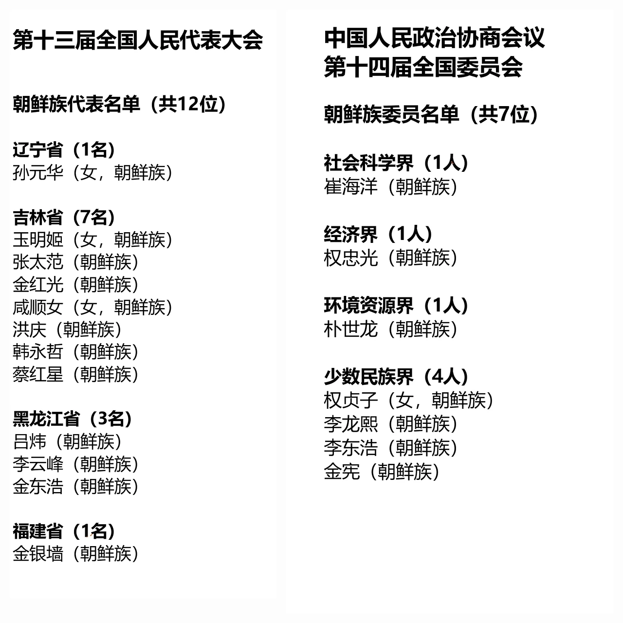여기에서 주목해야 할 것은 중국 조선족 인구가 170만 명에 불과함에도 전인대에서 12명의 대표를 배출했다는 점은 소수민족이라는 프리미엄이 붙었다 해도, 중국 조선족들이 정계에서 상당히 활약하고 있다는 것을 보여주고 있으며; 중국 정협에서 사회과학분야, 경제분야, 환경자원분야 등에서도 위원들이 있다는 것은 이미 각계분야에서 폭넓게 활동하고 있다는 상징이 되겠다.