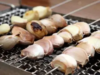 양꼬치와 마늘은 천생배필이다. 양꼬치를 구울 때 마늘과 같이 먹으면 맛을 증가하고 더욱 향기롭게 맛있게 한다. 양꼬치를 먹을 때 느끼하다 싶으면 생마늘을 그대로 먹어도 되고, 그 냄새가 심하다 싶으면 구워 먹어도 좋다.