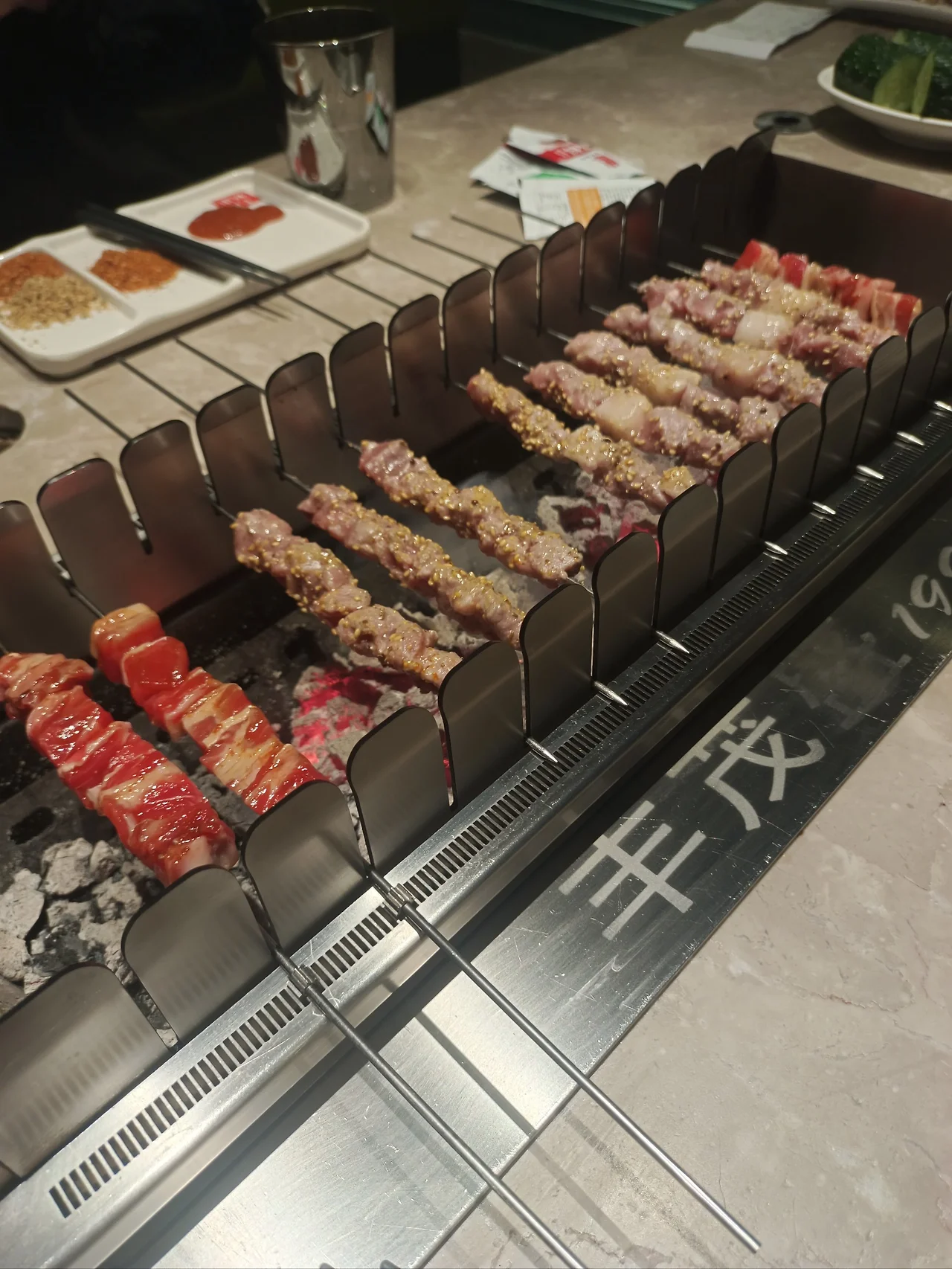 후에 겨울 같은 경우 양꼬치가 쉽게 식어서 맛이 떨어지는 경향이 있어서 조그마한 화로 같은 것에 목탄불을 넣어 테이블 위에 놓고 자체로 다시 데워 먹도록 고안하였다.