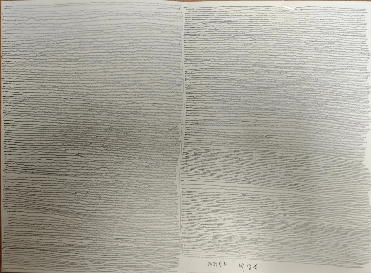 나이 60대 되여 보이는 선생님이 친절하게 반겨 주셨다. 가볍게 서로 인사를 하고, 그림을 통해 빈약해진 상상력을 찾아보려고 한다고 말을 하니, 도화지 한장과 연필을 손에 쥐여주시면서 위에 쓱 한줄 그으시고, 따라 그려 보라고 한다. 최대한 촘촘히 그리고 한힉에 한줄씩 긋어 보라고 한다.