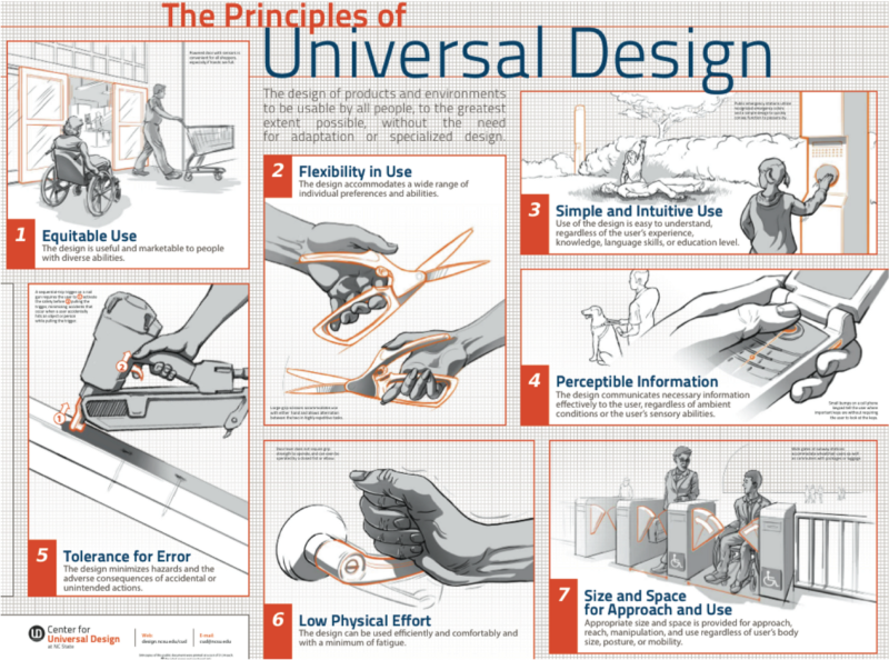 유니버셜 디자인센터(美 노스캐롤라이나 주립대)에서 공표한 유니버셜 디자인을 위한 7가지 원칙은 다음과 같다.