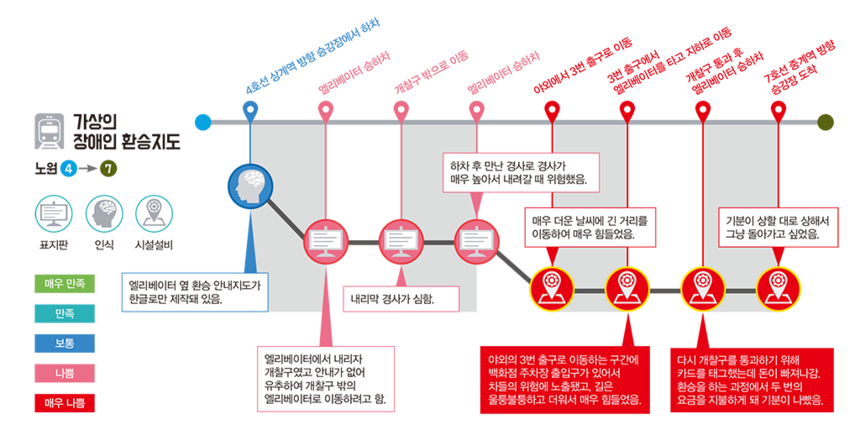 유모차나 휠체어를 타는 사람들이 좀 더 편하게 타고 내리는 환승 경로를 알려주는 무의의 ‘서울 지하철 프로젝트’ 도 이런 배리어 프리 디자인( Barrier Free Design)의 개념을 적용한 것이다. 특정한 누군가를 위한 디자인들을 별도로 만드는 것보다 처음부터 누구에게나 편하도록 만든 보편(Universal)적인 개념이었다면 좋았겠지만 아직까지 많은 것들이 그렇지 못하다.