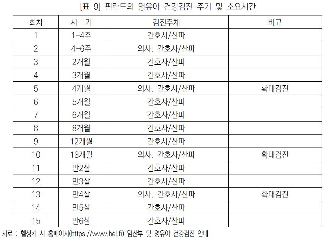 핀란드의 영유아 건강검진은 출산 1주 후부터 학교예비반(esikoulu, preschool)에 들어가는 6살까지 총 15회 가량 간호사 혹은 산파에 의해 행해지며, 의사의 검진은 총 5회(4~6주, 4개월, 18개월, 4년)에 걸쳐 행해집니다. 또한 4개월, 18개월, 4살에는 확대검진이 실시됩니다. 출생 직후부터 3개월까지 4회, 1년까지 9회, 18개월 이후로는 매년 1회씩으로 검진주기가 길어지는 것이 특징입니다.