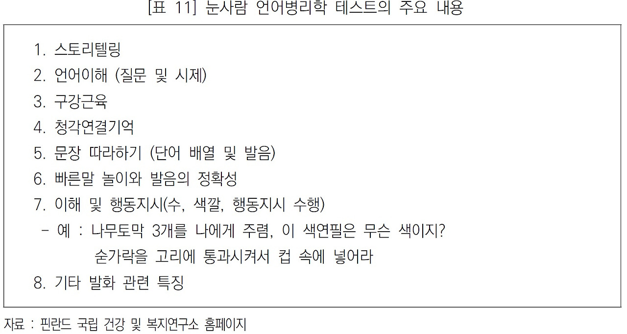 상기 <표 10>에 나타난 ‘눈사람’(Lumiukko)은 투르쿠 대학교 언어병리학과 Pirjo Korpilahti 교수(현재 은퇴)가 개발한 테스트로, 10-15분 간 아동이 흥미를 가질 만한 여러 사물이 등장하는 그림을 제시하고 아동이 스스로 설명하거나 질문에 대답하고, 말로 제시된 지시를 이행한 결과를 ‘양호하게 이행/실수가 있음/불이행’의 3가지 평가기준으로 평가합니다.