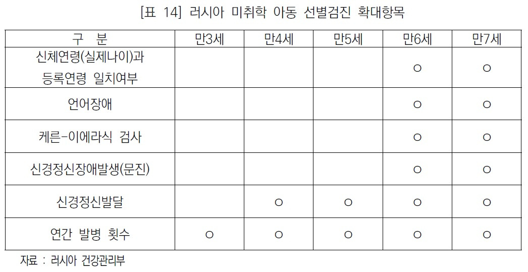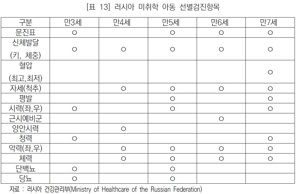 러시아의 취학 전(만 3세-취학 직전인 만 7세) 선별검진항목의 전체적인 특징은 평가기준이 매우 단순한 편이라는 점입니다. 문진, 시력, 양안시력, 청력의 경우 정상/비정상, 신체발달의 경우 우리나라와 핀란드의 경우처럼 성장곡선을 통해 개개인의 성장속도 변화를 확인하는 것이 아니라 정상/평균신장 미만/체중미달/비만 등으로 검진시점의 이상여부만을 기록하고 있습니다.