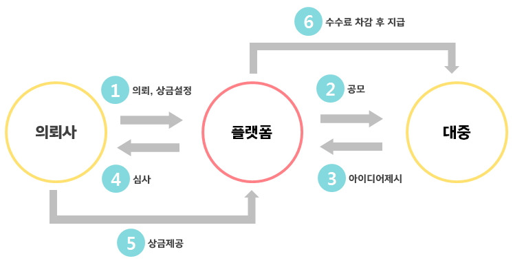 (1) 개요 : 기업의 의뢰로 비즈니스 모델 고도화, 내부 문제점 해결, 상품 판매촉진 등을 위해 대중들의 아이디어를 공모하여 취하고 이를 '상금'으로 보상함